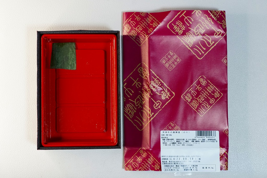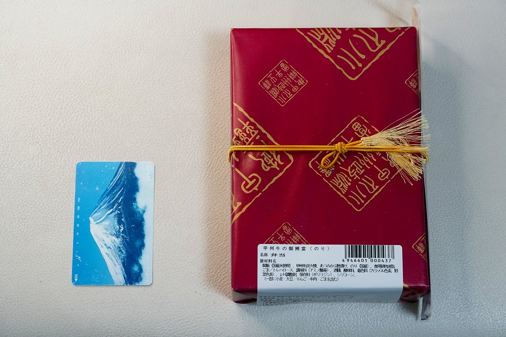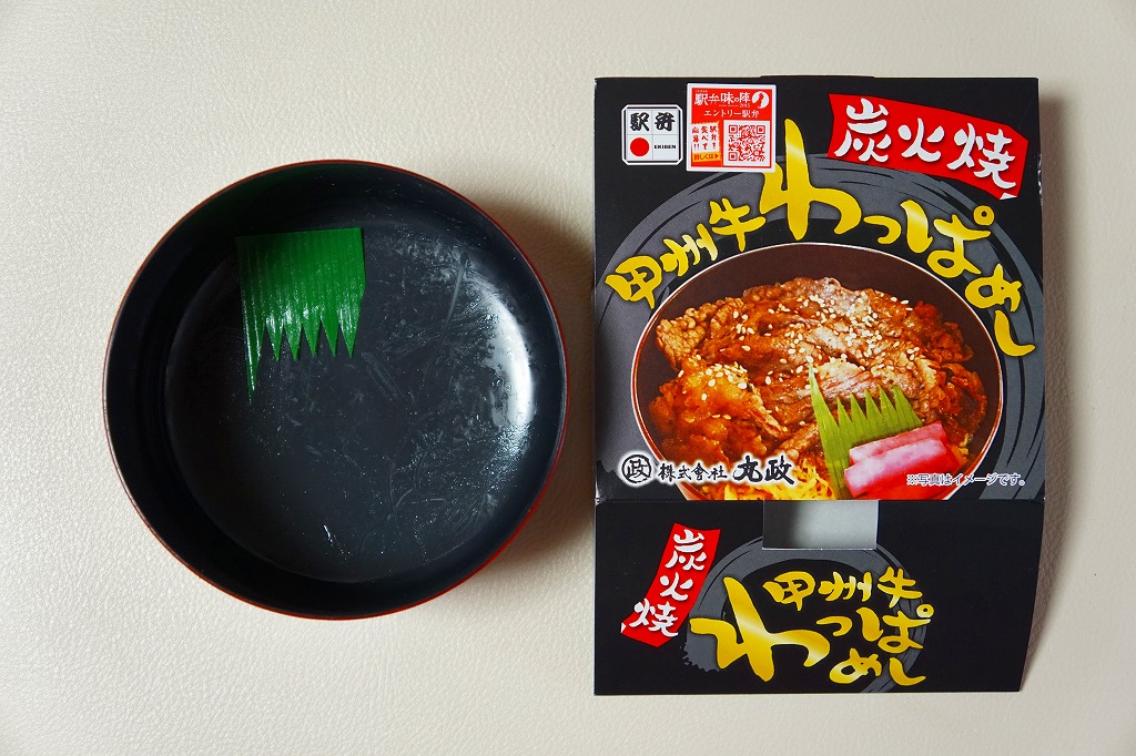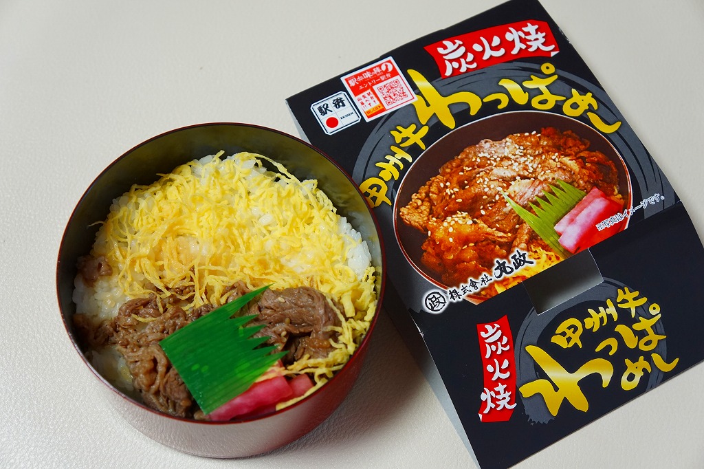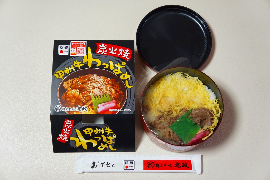 白御飯を海苔と牛焼肉で覆い、赤かぶ漬を添える、赤黒いプラ製トレーを収めた黒い長方形の容器を、印章の柄を持つ包装紙で包む姿は、下記の駅弁「小淵澤丸政之信州牛御辨當(小淵沢丸政の信州牛弁当)」とほぼ同じ。その信州牛が「甲州牛」に替わり、商品名と掛紙の印章に反映される。味はそれとまったく同じといってよく、脂身と赤身と焦げの香りと、肉の適度な柔らかさが印象的。価格もおそらく同額だろう。
