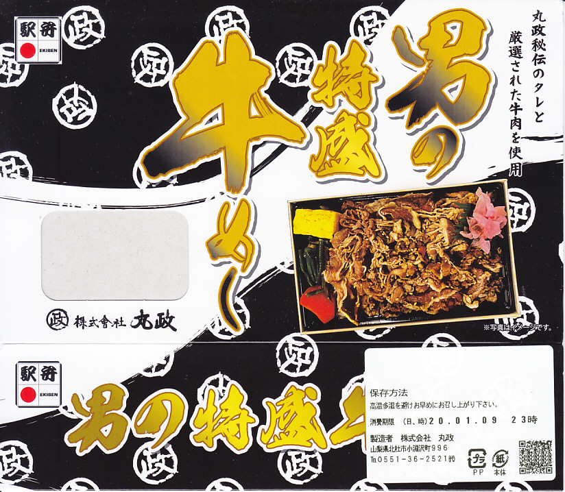 2019(平成31)年4月13日に購入した、小淵沢駅弁のスリーブ。上記の駅弁「男の特盛牛めし」と、名前や絵柄は異なるが、言いたいことはおおむね似ている。容器も当時はプラスティック素材のみでできていたが、中身や味や価格は変わらない。