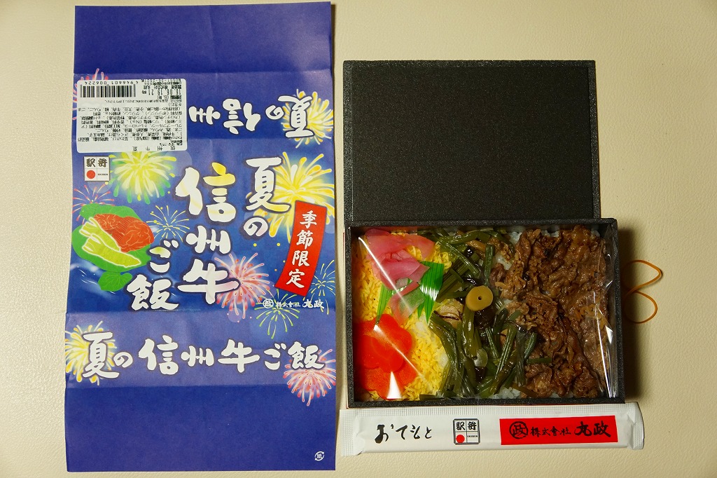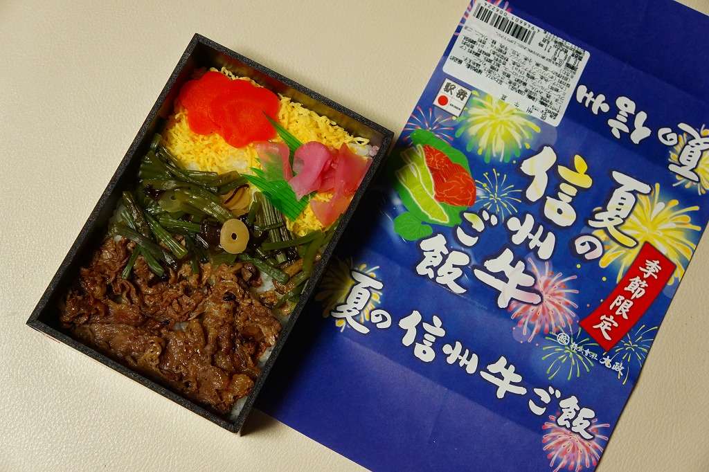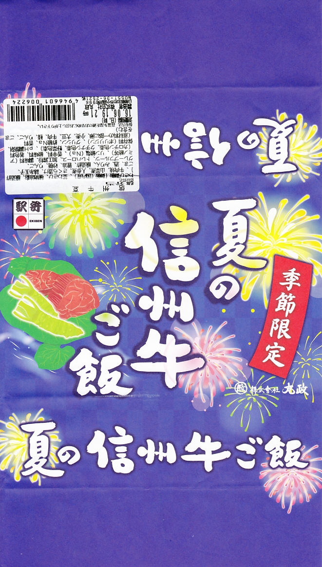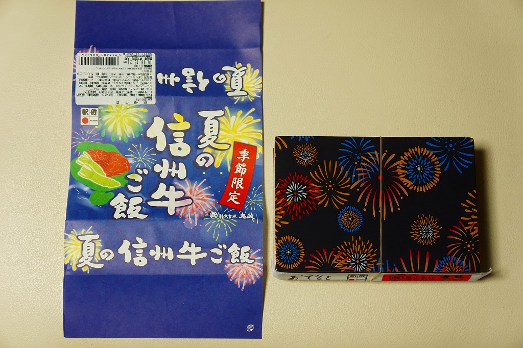 2015(平成27)年夏の発売か。6月下旬頃から9月上旬頃までの販売か。名前のとおり、夏季限定の駅弁。掛紙に加えて容器にも、花火の模様が入っている。中身はワサビ飯の上を、錦糸卵と山菜煮と牛肉焼で覆い、ニンジンと大根桜漬を添えるもの。濃いめの色と味付けで、肉の旨味がおかずになったものの、大きな文字で「信州牛」を名乗るには、肉の分量が淋しいと思った。2020年までの販売か。