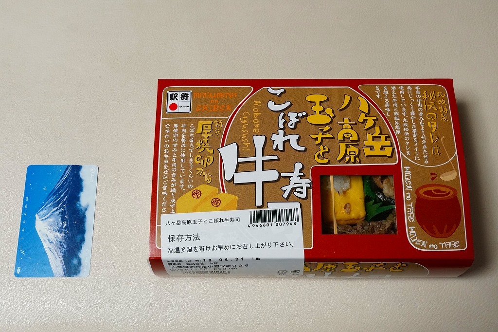 秋冬の駅弁大会シーズンに向けた、2020(令和2)年秋の新商品か。軽くて薄い長方形の容器に茶飯を詰め、牛肉の炭火焼で覆い、玉子焼、にんじん煮、山菜煮、大根桜漬を添える。お肉のパサついた見栄えとふわふわな食感を含め、内容と価格が2018〜2020年販売の「男の特盛牛めし」と同じなので、これを改称した催事向け商品だろう。小淵沢がもし牛肉の著名な産地であれば、このシンプルな牛肉駅弁は、ここならではの味を持つ定番の商品になったかもしれない。スーパーやデパート、東京駅の駅弁売店「駅弁屋 祭」で、時々売られるのではないかと思う。