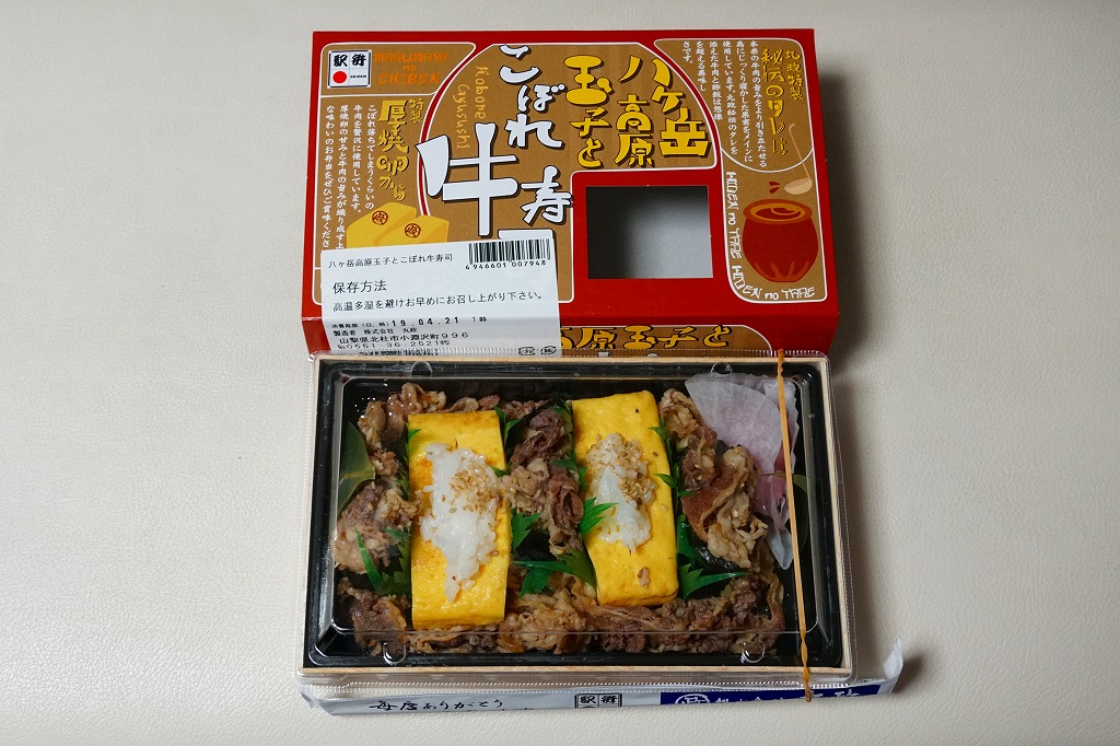 2016(平成28)年10月の発売。主に東京都内で売られる商品である模様。茶飯を牛焼肉と玉子焼で覆い、赤かぶ漬を添える、シンプルな駅弁。そんな牛丼か牛すき焼丼に見えて、小淵沢駅弁の他の牛焼肉丼と同じく、ちゃんと焼肉の味と香りがした。パッケージや中身の見栄えでなんとなく、東京で有名になった新潟駅弁「えび千両ちらし」を思い起こす。価格は2016年の発売時で1,050円、2020年時点で1,100円。