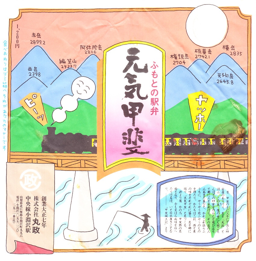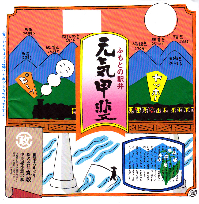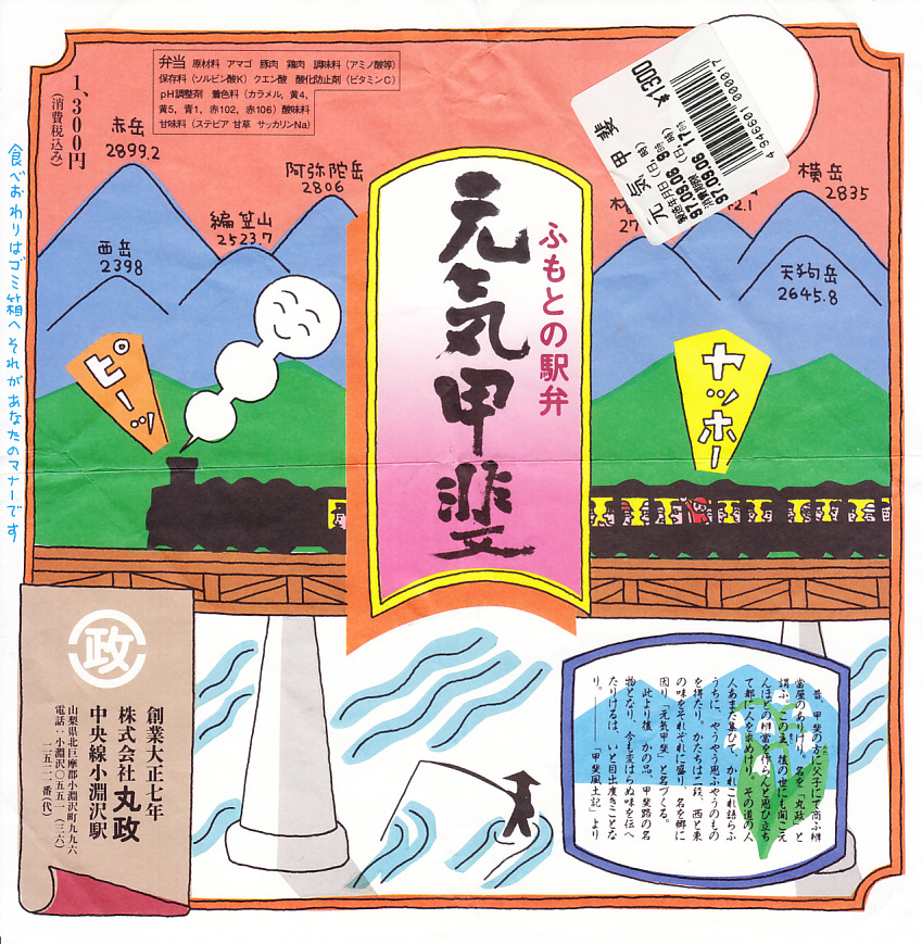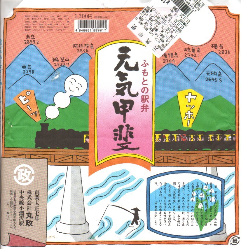 1997(平成9)年9月6日8時の調製と思われる、昔の小淵沢駅弁の掛紙。絵柄が発売時から現在まで変わらない、おそらく変えられない「元気甲斐」の掛紙。調製印がラベルになり、権現岳などの山の名前を隠してしまった。そこ以外に余白のない絵柄なので、食品表示は山の上になんとか収めた感じ。