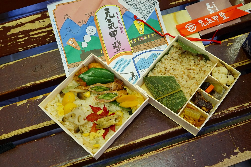 経木折の中身は、下段が東京の料亭「吉左右(きっそう)」の作品で、栗とシメジの混ぜ御飯にワカサギや鶏やアスパラの唐揚げ。上段は京都の料亭「菊乃井」の作品で、炊き込み御飯に香の物類が並ぶ。たちまち小淵沢の名物となった駅弁のこの姿は、発売当時から変わらない。調製元は発売当時の製作過程ビデオを用いて、品質を保つという。同時に復刻販売が始まった汽車土瓶も、価格を上げながら販売を続ける。