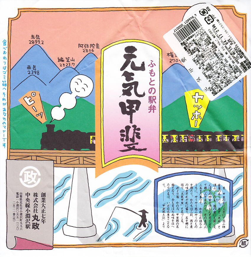 2001(平成13)年11月24日に購入した、小淵沢駅弁の掛紙。おそらくこの駅弁の誕生の経緯により、絵柄は発売時から現在まで同じである。調製元所在地、食品表示、その他法令上の標記が、時代により変わる。