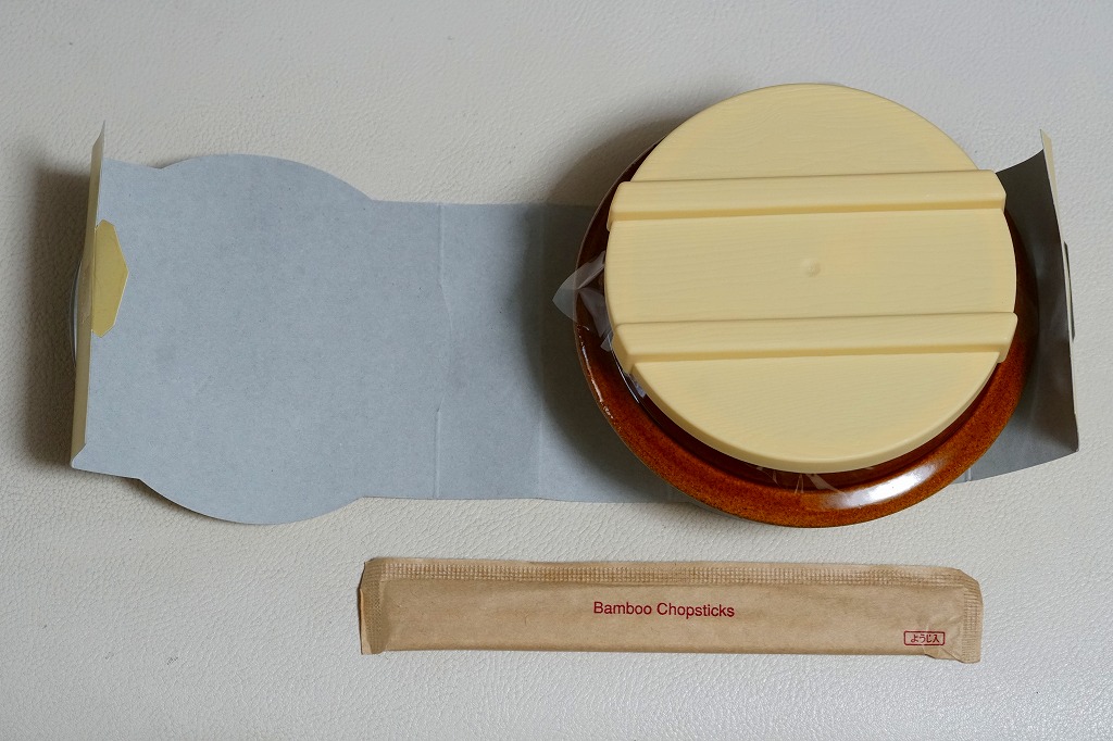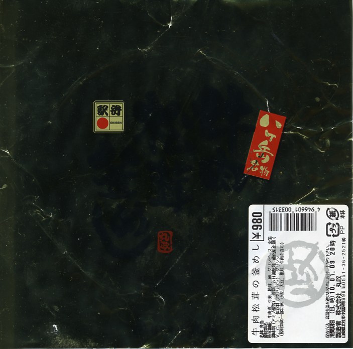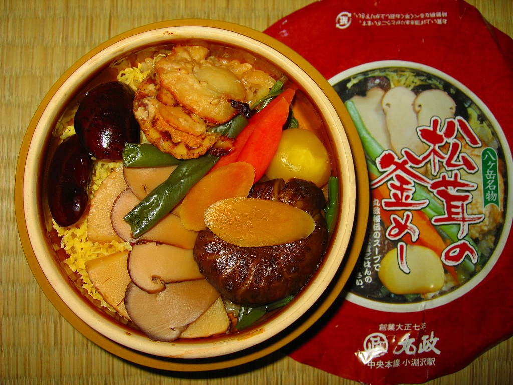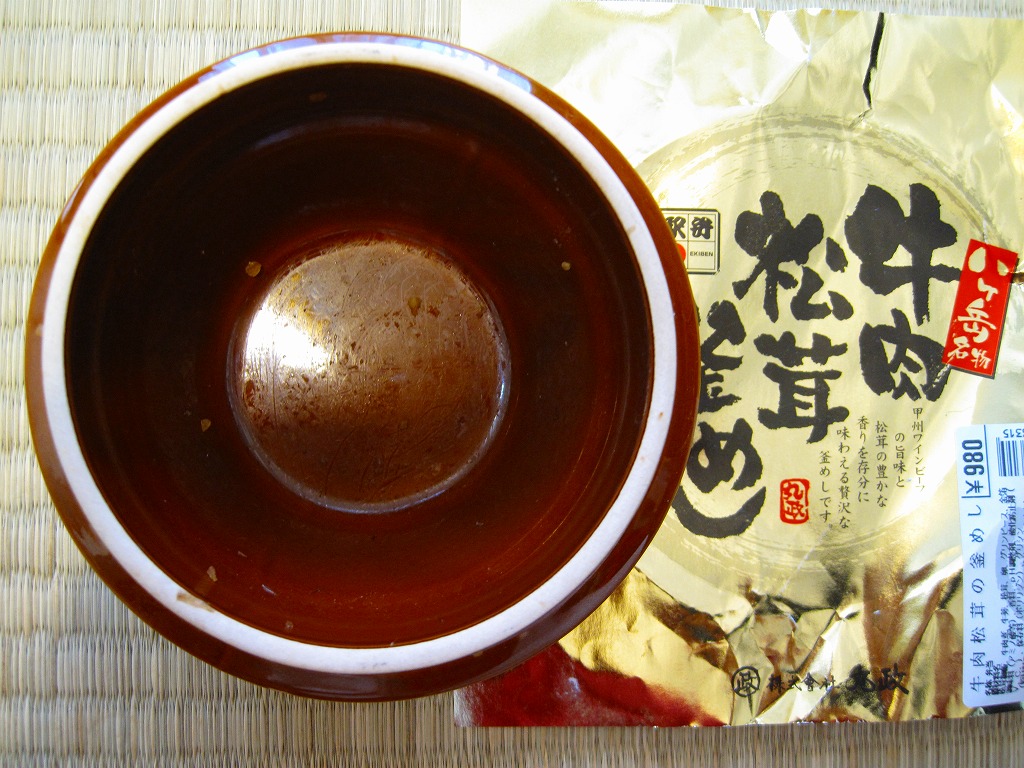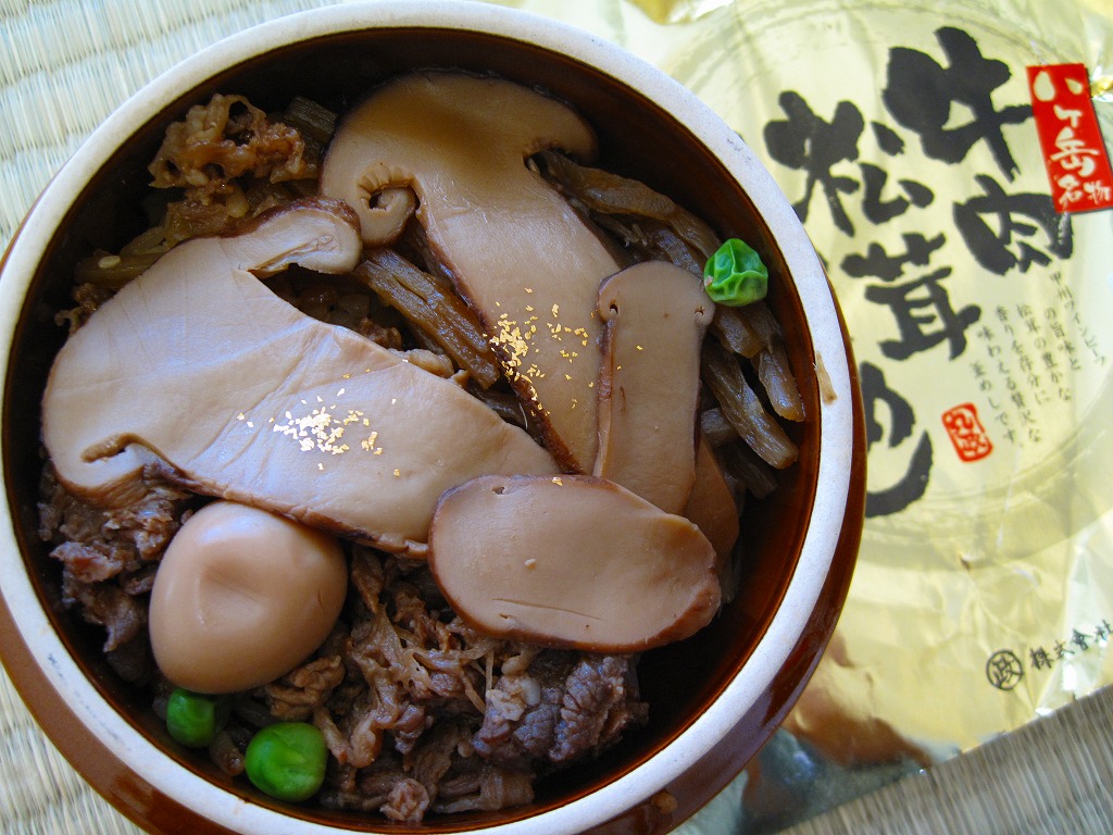 秋冬の駅弁大会シーズンに向けた、2009(平成21)年秋の新商品か。調製元の公式サイトによると、1985(昭和60)年発売の秋季限定駅弁だそうな。焼き物の釜飯向け容器にプラ製のふたをして、金色の掛紙をかけて、赤いひもで十字にしばる。中身は白御飯の上を牛肉煮で覆い、グリーンピースを散らしてゴボウ煮を添えて、さらにマツタケ煮で覆ってウズラの卵を置き、その上に金粉を撒くもの。