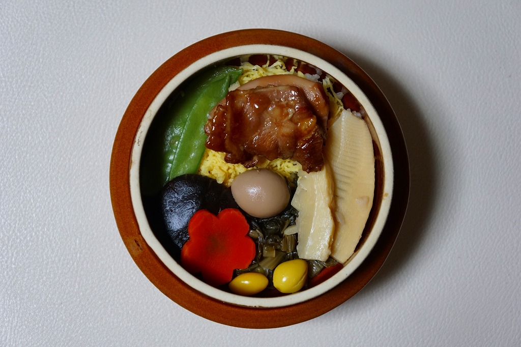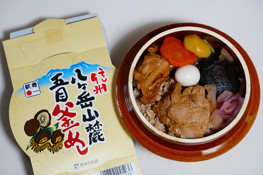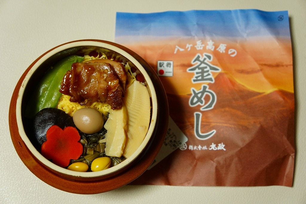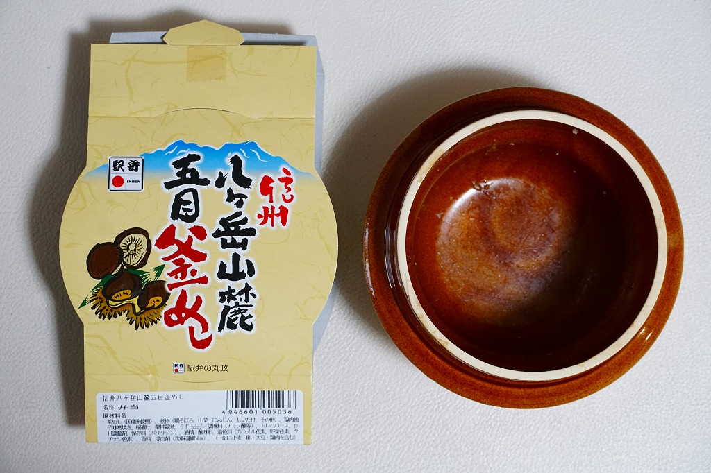 2016(平成28)年2月の鶴屋百貨店の駅弁大会でデビューか。陶製の本体にプラ製のふたをする釜型容器に、山の風景を描いた掛紙をかける。中身は茶飯を錦糸卵と野沢菜で覆い、鶏肉、タケノコ、シイタケ、きぬさや、うずらの卵、ギンナン、ニンジンで覆うもの。このページにたくさん掲載している、小淵沢駅の釜飯駅弁と同じタイプ。小淵沢駅弁を小淵沢駅以外の場所で見る機会は多いが、外国人観光客で賑わう富士急行の河口湖駅で見るとは思わなかった。これは「五目」で、他に「牛」があったらしい。2017年までの販売か。