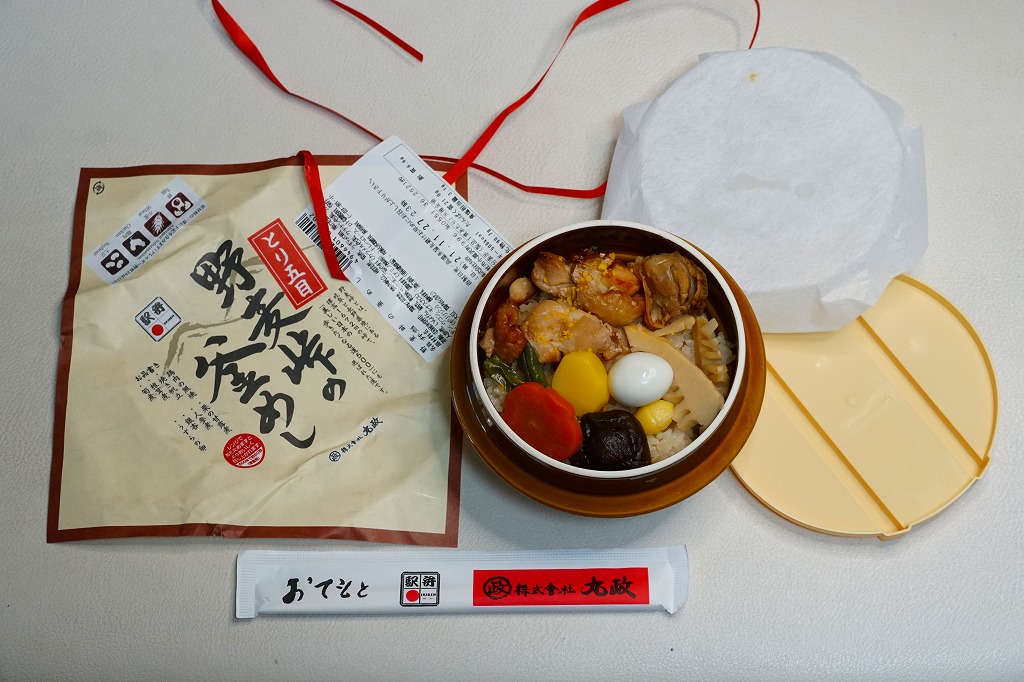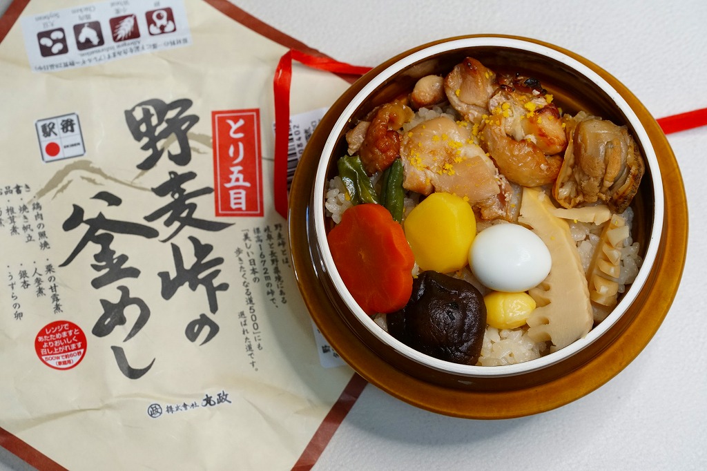 秋冬の駅弁大会シーズンに向けて、2020(令和2)年の9月に発売か。焼き物の釜飯向け容器にプラ製のふたをして、商品名を描いた正方形の掛紙をかけ、ひもで十字にしばる姿は、横川駅の名物駅弁「峠の釜めし」に似る。中身は茶飯を鶏肉、ホタテ、シイタケとタケノコとニンジンの煮物、いんげん、ぎんなん、うずらの卵などで覆うもので、やはり「峠の釜めし」とかなり似る。そう思うと、駅弁の名前にも「峠の釜めし」を含んでいる。1960年代以降、北海道から九州まで各地に出現した横川駅弁の類似品の中で、現時点ではこれが最も似ていると思う。味や雰囲気も、それに近い。漬物の別添がないのは、大きな差だと思う。