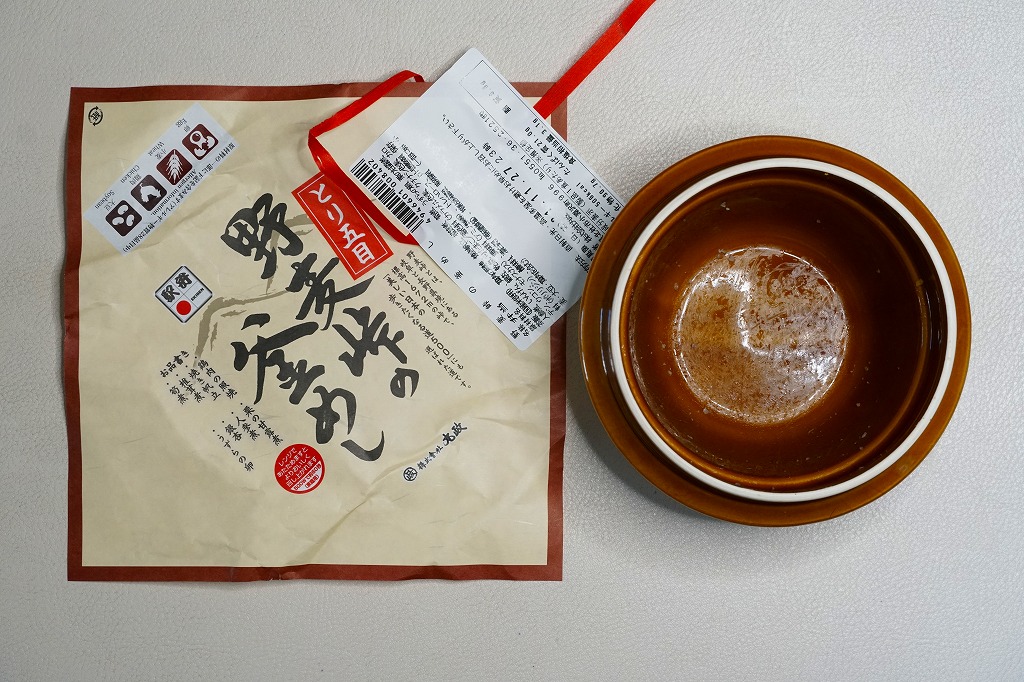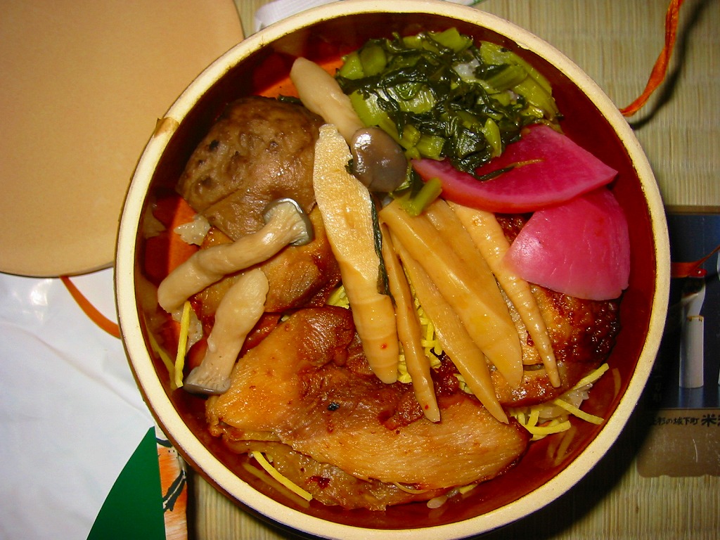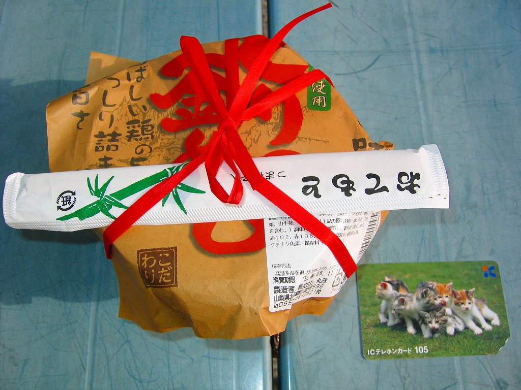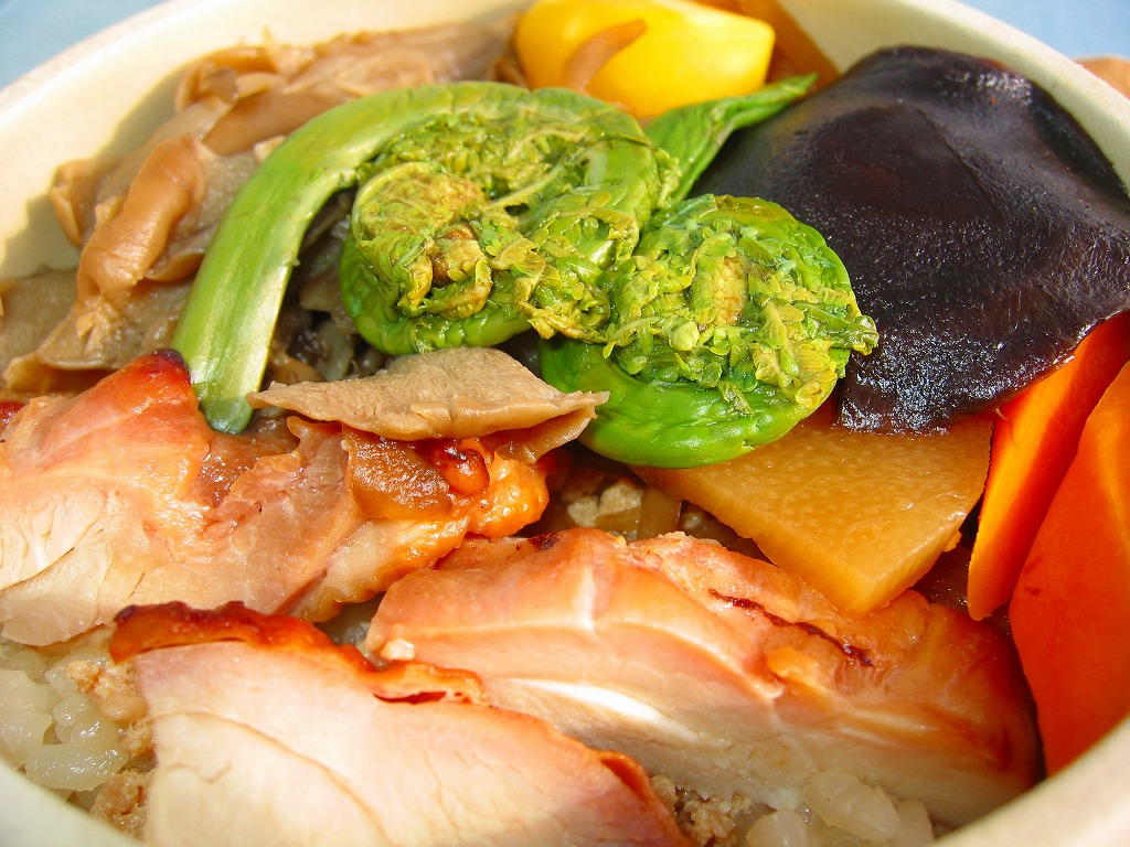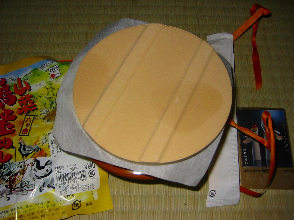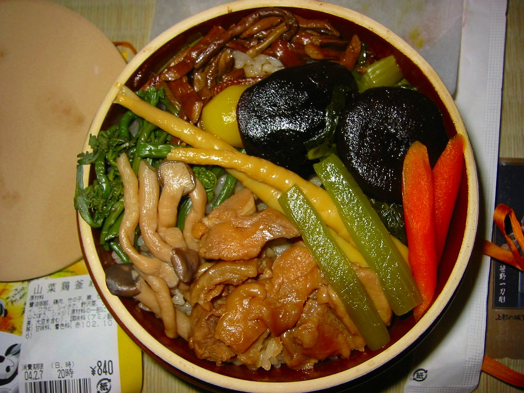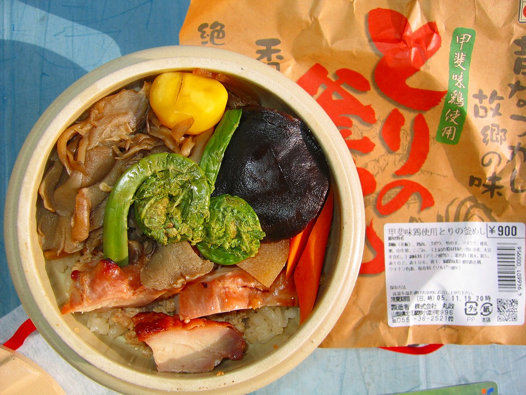 秋冬の駅弁大会シーズンに向けた、2005(平成17)年の秋の新商品か。焼き物の釜飯向け容器に陶製のふたをして、商品名を描いた正方形の掛紙をかけて、ひもで十字にしばる。中身は茶飯の上を鶏肉やごぼうや椎茸や山菜や栗や舞茸などで覆うもので、標準的な釜飯駅弁。色彩のくすみ、あるいは落ち着きは、小淵沢駅の釜飯駅弁の特徴だと思う。風味も同様。