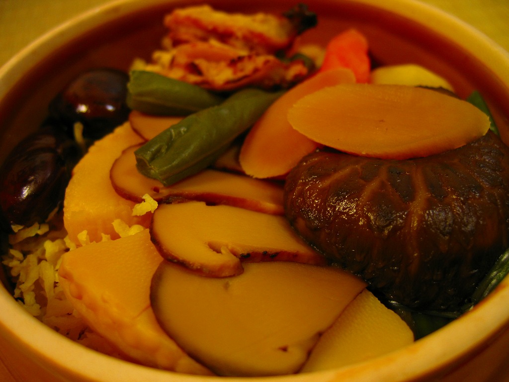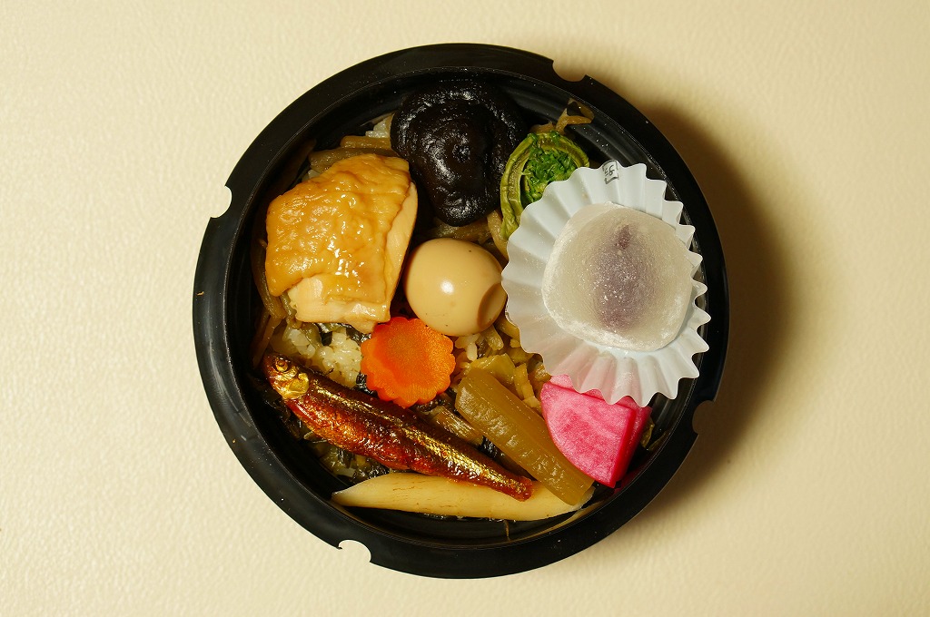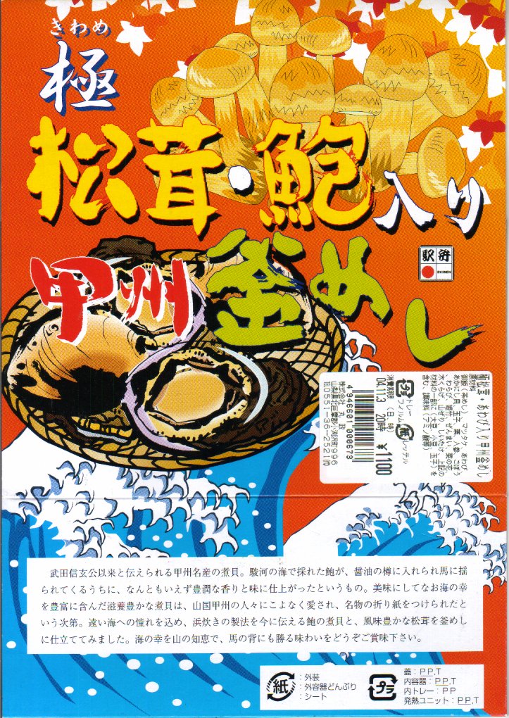 秋冬の駅弁大会シーズンに向けた、2004(平成16)年の秋の新商品か。円形の加熱機能付き容器を、賑やかな柄のボール紙にはめる。中身は茶飯の上に錦糸卵を敷き、松茸や山菜やきんぴらやアワビを載せるもの。