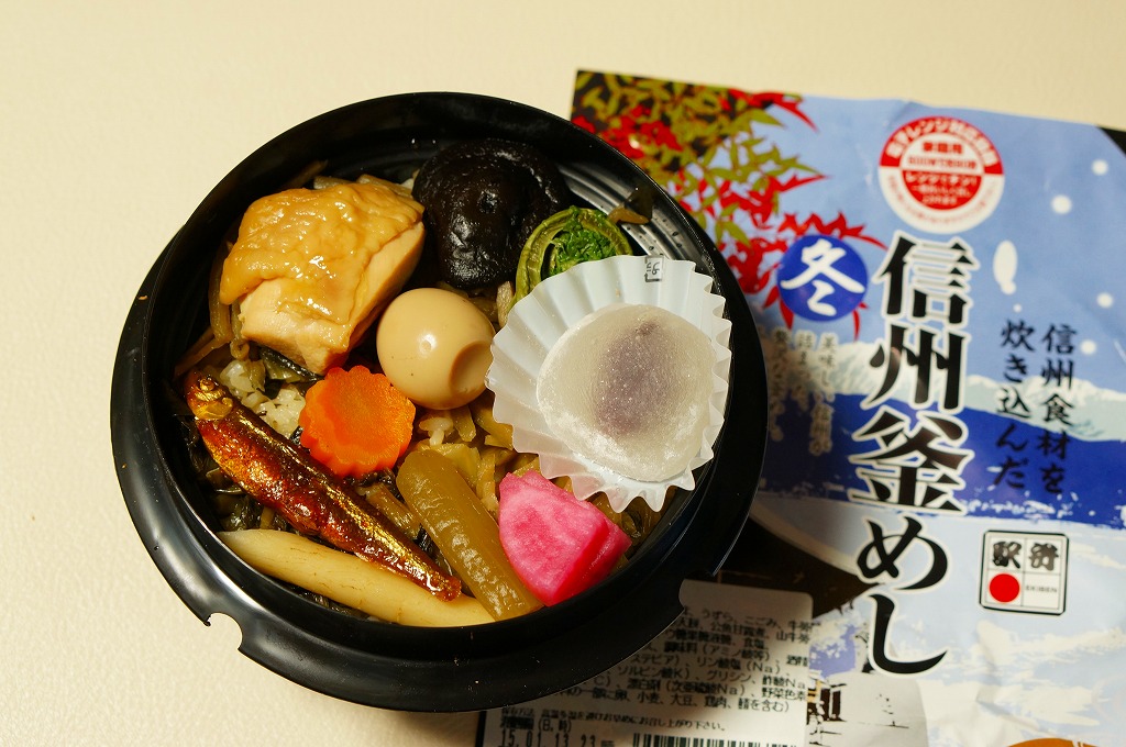 この小淵沢駅弁あるいは茅野駅弁の季節の釜飯は、2014(平成26)年度あるいは同年秋の発売だろうか。電子レンジ対応と思われる真っ黒なプラ製の釜に茶飯を詰め、鶏肉やシイタケやうずら卵などの煮物、ワカサギ甘露煮、野沢菜、寒天餅などで覆う。釜飯駅弁として、しっかりしたつくりになっていると思うが、このページにある様々な釜飯と同じく、この商品の主戦場は駅弁催事であると考えられる。現地で買って食べたという話は、ほとんど見られない。これは「冬」版で、他に「秋」と「春」があったらしい。2018年の「春」版をもって、同年の4月頃に終売か。