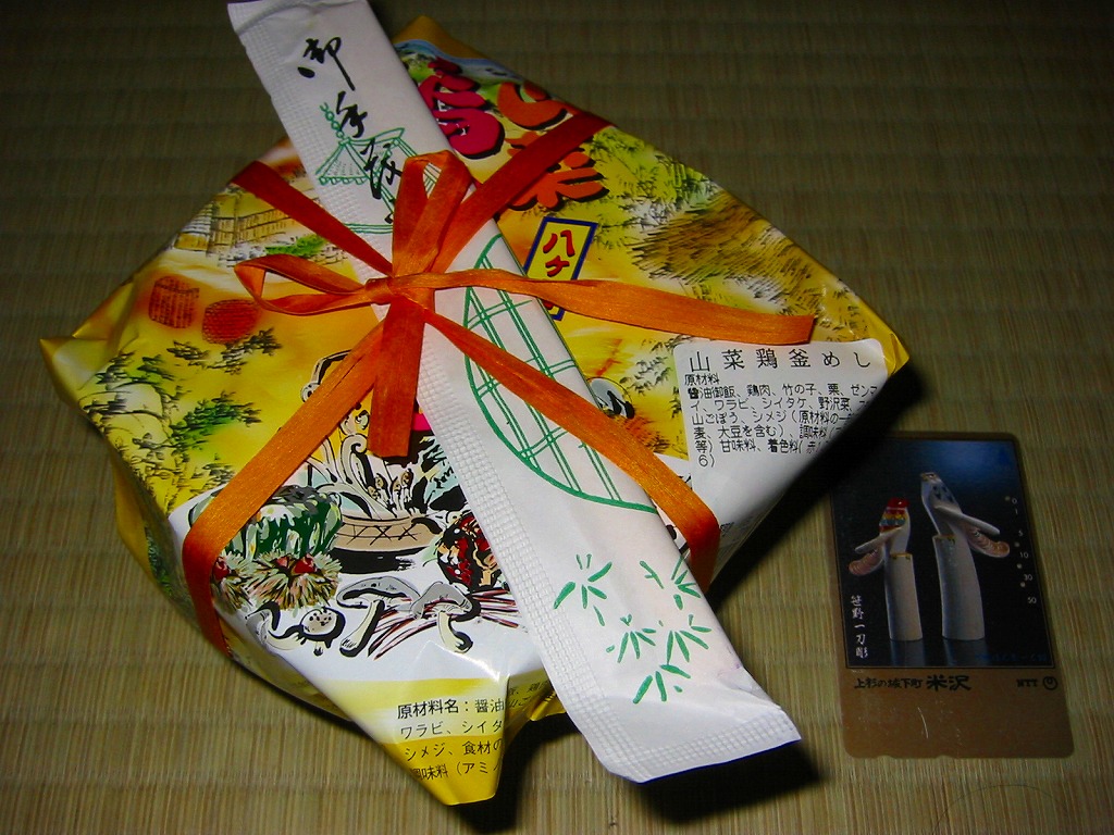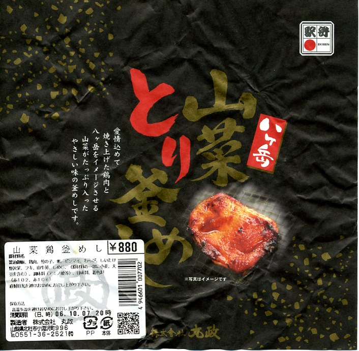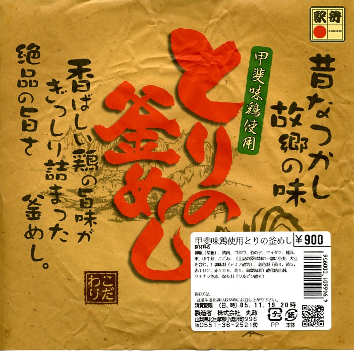2004(平成16)年1月に発売か。焼き物の釜飯向け容器に陶製のふたをして、商品名を描いた正方形の掛紙をかけて、ひもで十字にしばる。中身は炊込御飯を錦糸卵、鶏肉、竹の子、椎茸、しめじ、姫竹などで覆うもので、釜飯駅弁の正統。同じシーズンに併売の「山菜鶏釜めし」と、とてもよく似ているので、小淵沢駅の釜飯駅弁は駅弁催事での需要が旺盛なのだろうと思う。駅弁大会対応商品。2004年のみの販売か。