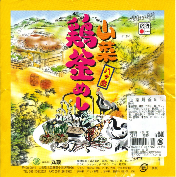 上記の駅弁「八ヶ岳山菜とり釜めし」の、2004(平成16)年2月時点での姿で、2003年の発売当時の姿。容器や中身が一緒でも、掛紙の絵柄が異なるだけで、まるで新作か別バージョンの駅弁に見えてくるもの。駅弁催事向け商品なのだろう、これも駅弁大会で購入した。2006年1月の京王百貨店の駅弁大会では、これが長野県の茅野駅の駅弁と紹介され、さらに「八ヶ岳の山菜馬かめし」というすごい誤記で会場内掲示に載り、ネット上がざわついた。