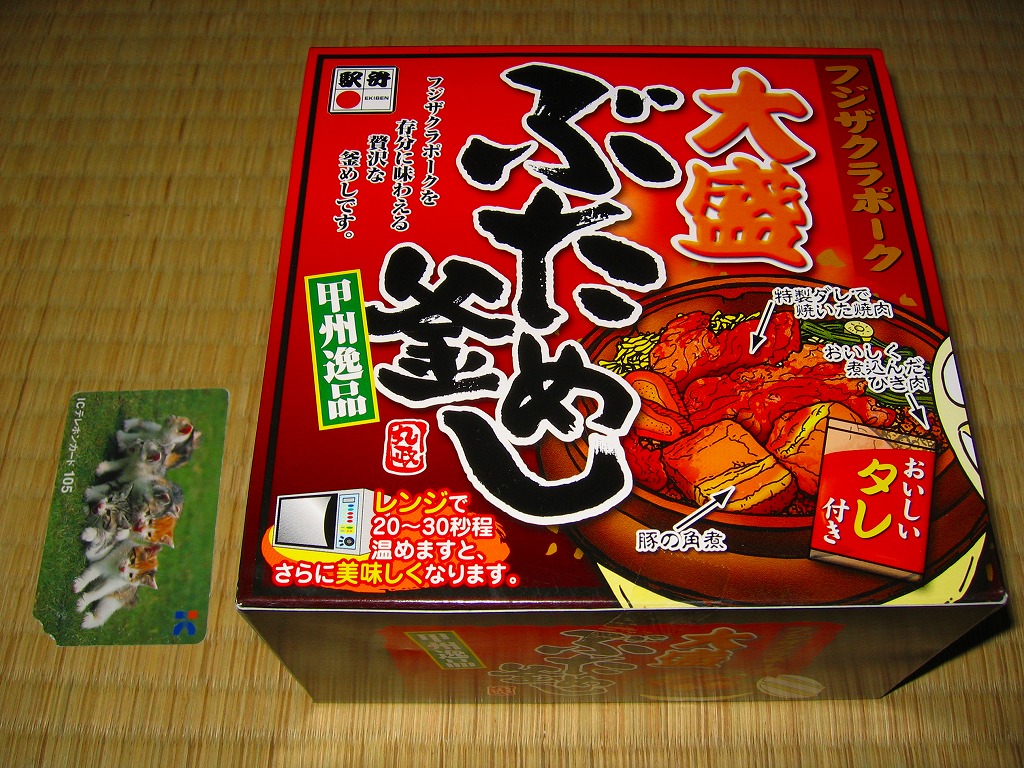 秋冬の駅弁大会シーズンに向けた、2007(平成19)年の秋の新商品か。加熱機能付き駅弁を思わせる、弁当向けには大きなボール紙の箱の中に、柔らかいプラ製の釜型容器がひとつ収まる。中身は紙箱の写真のとおり、御飯の上に山菜などを敷いたうえでフジザクラポークの豚ひき肉、豚角煮、豚焼肉で覆うもの。