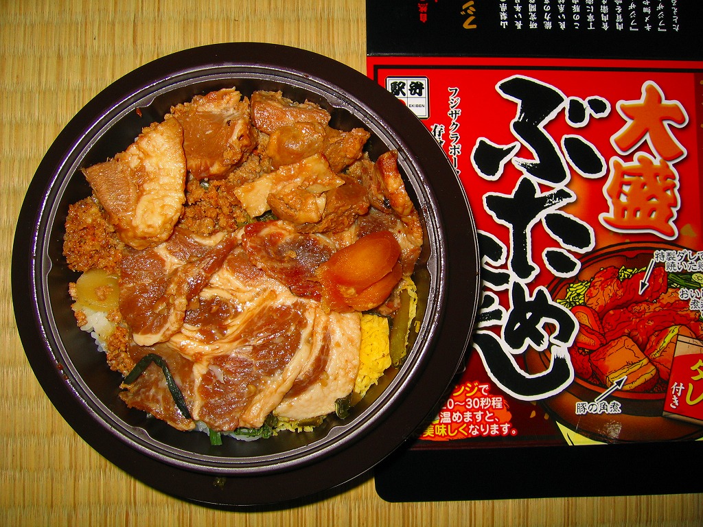 決して分量の多い駅弁ではないが、駅弁の名前どおり大盛の雰囲気がたっぷり。豚焼肉のレア感は他の駅弁では味わえないし、豚肉の品質も良さそう。ただ、パッケージにわざわざ電子レンジのイラストまで掲載して加熱を勧めたり、購入箇所が疑義駅弁の販売に積極的だったり、ネット上での発表や報告状況などを見ると、現地で見られない駅弁大会専用商品の疑念はある。2009年までの販売か。