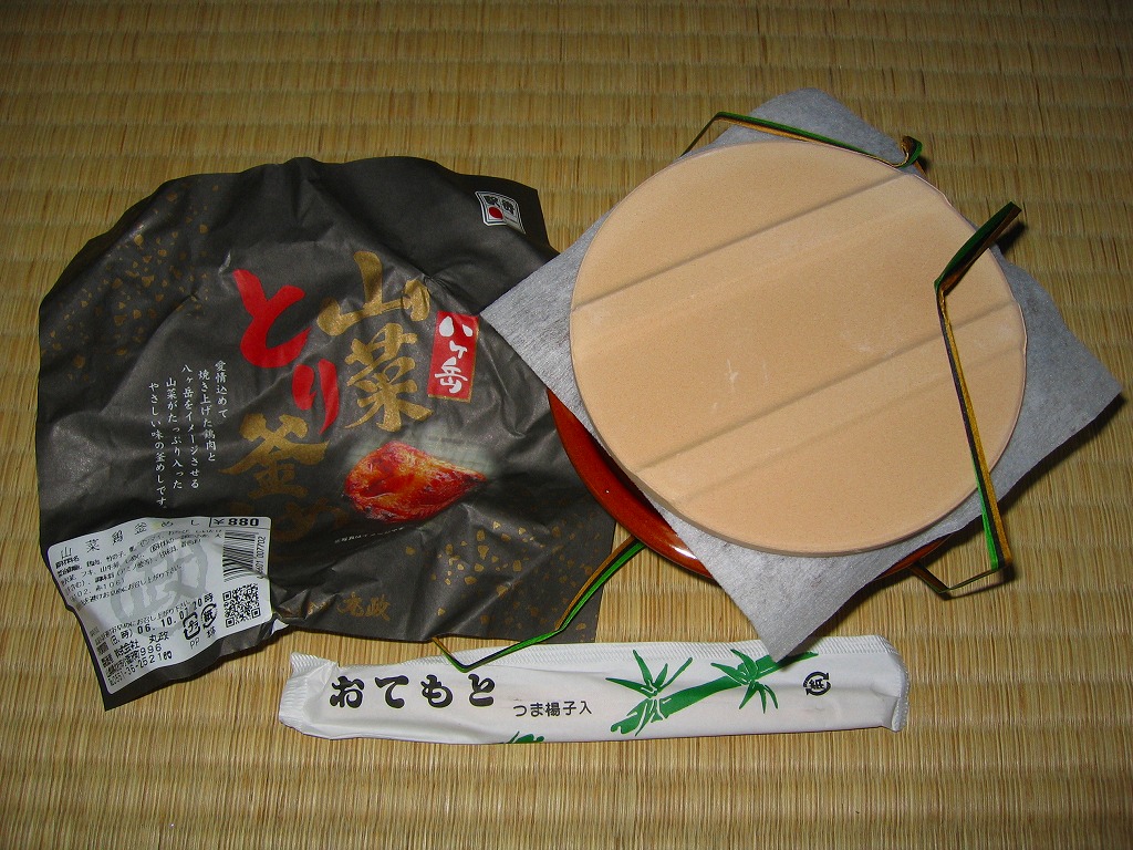 秋冬の駅弁大会シーズンに向けた、2003(平成15)年の秋の新商品か。焼き物の釜飯向け容器に陶製のふたをして、商品名を描いた黒い掛紙をかけて、ひもで十字にしばる姿は、釜飯駅弁の元祖で横川駅の名物駅弁「峠の釜めし」と同じ。中身は茶飯を山菜、鶏照焼、シイタケ、くりなどで覆うもので、これは駅弁の名前のとおり。