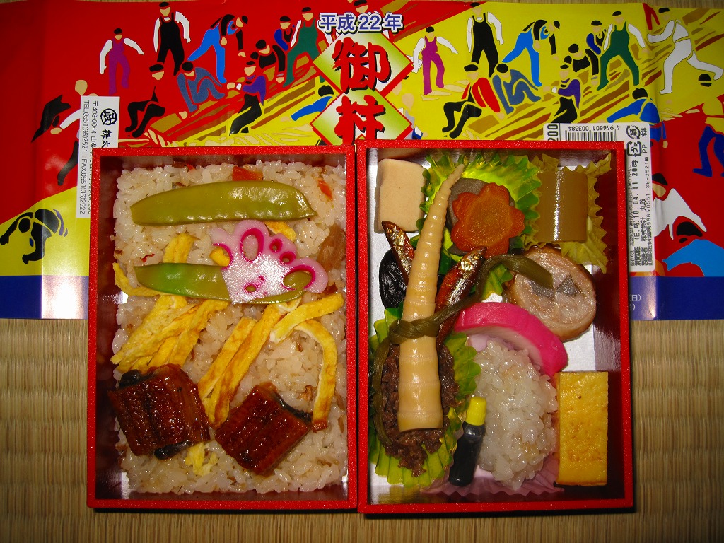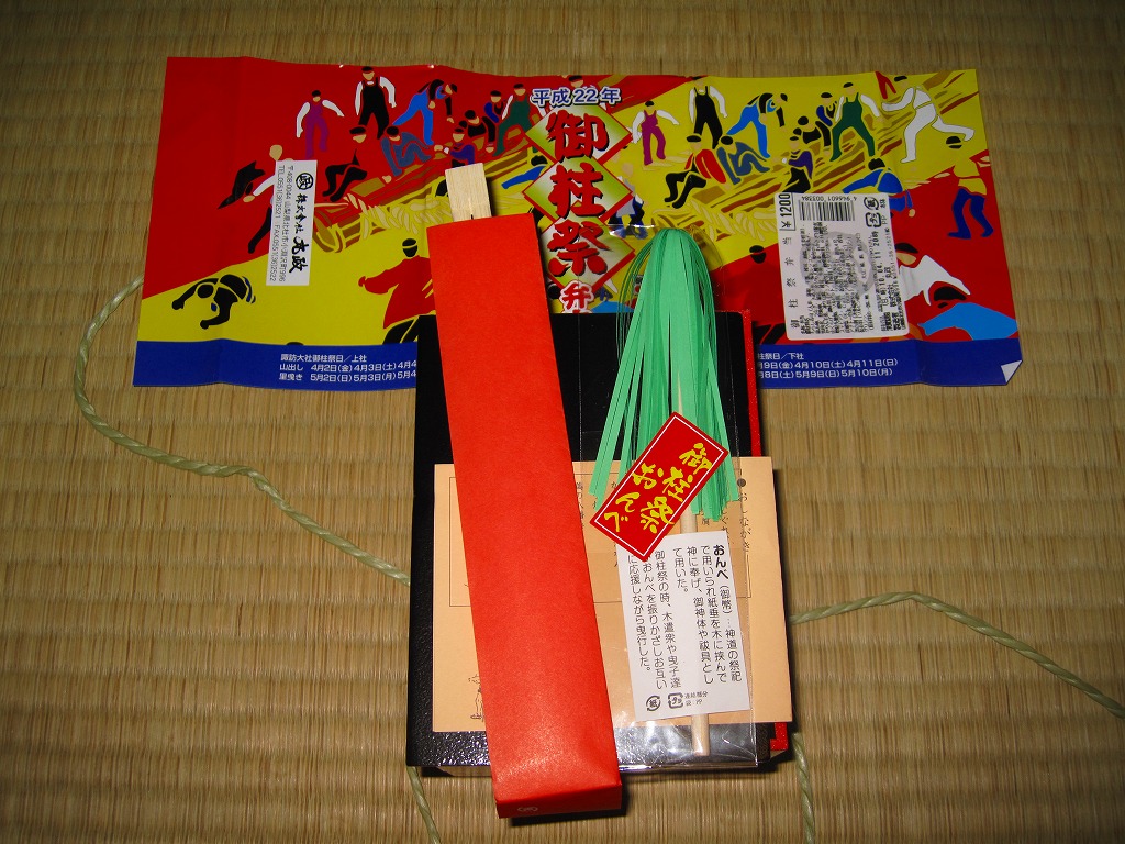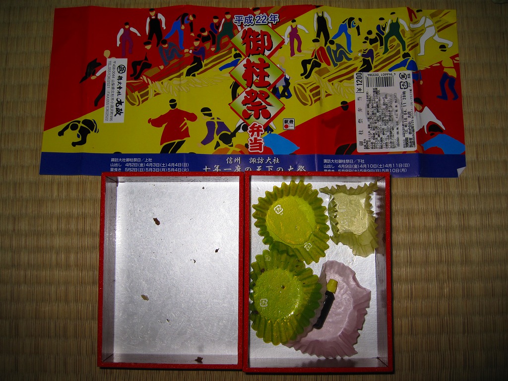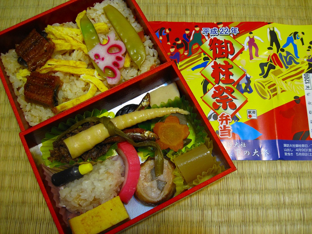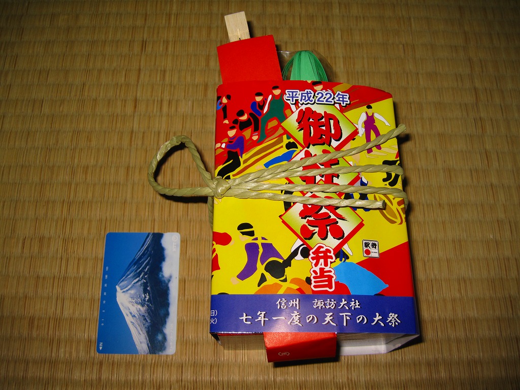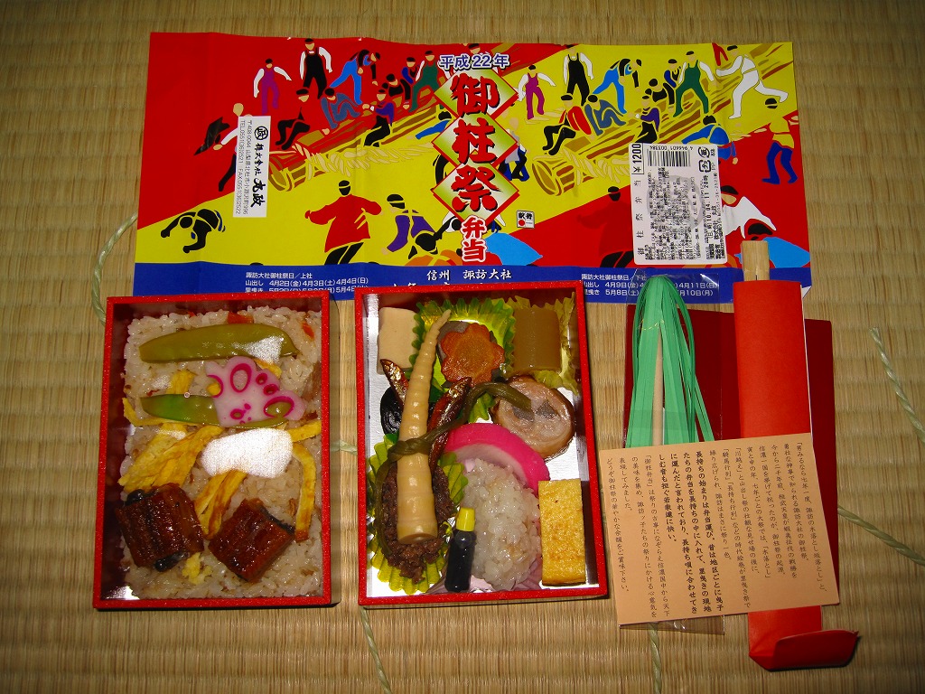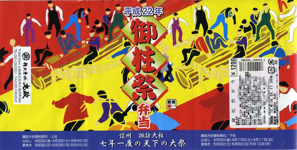 2010(平成22)年3月頃に発売か。6年毎、数え年では7年毎に開催される諏訪大社の御柱祭(おんばしらまつり)に合わせて、2004年以来6年ぶりに再登場した駅弁。今回は長方形でも黒塗りの容器を二段重ねにして使用、おしながきと割りばしと「おんべ」を添えて、前回と同じ意匠の掛紙を巻く。中身もおおむね、前回と同じ。