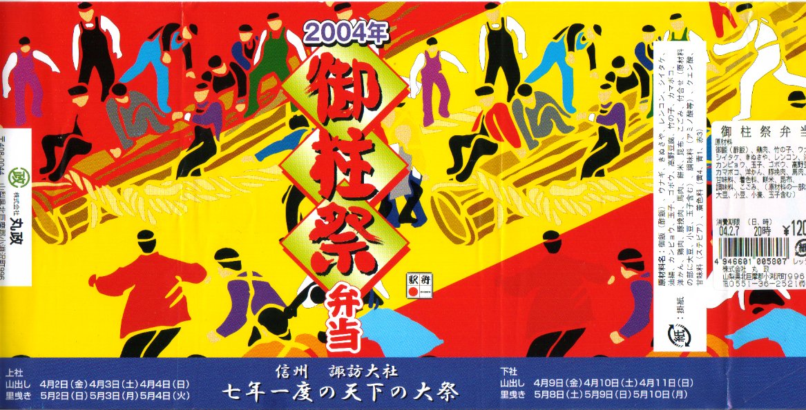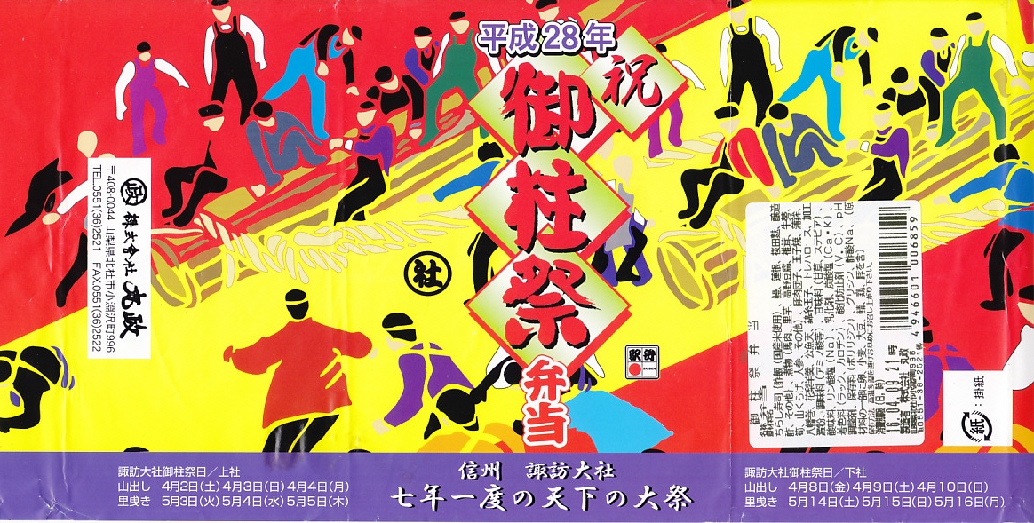 2016(平成28)年4月9日に購入した、小淵沢駅弁の掛紙。6年ぶりの御柱祭弁当で、4月から5月まで現地や東京エリアで販売された模様。掛紙も容器も中身も「おんべ」付きも、前回とほとんど同じ。次は2022(平成34)年の販売か。