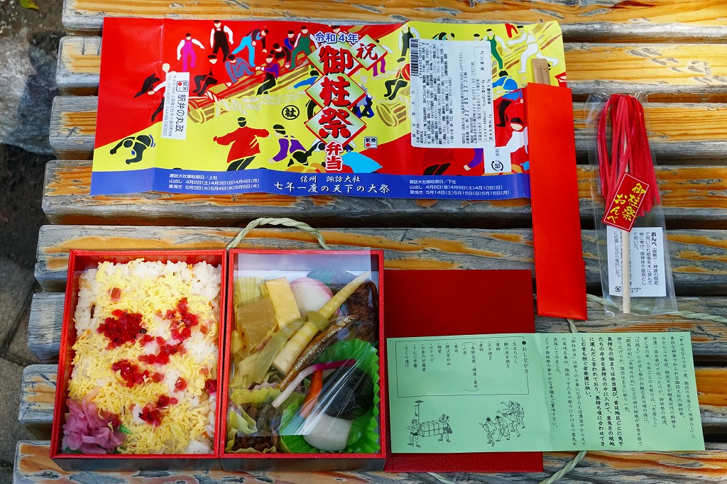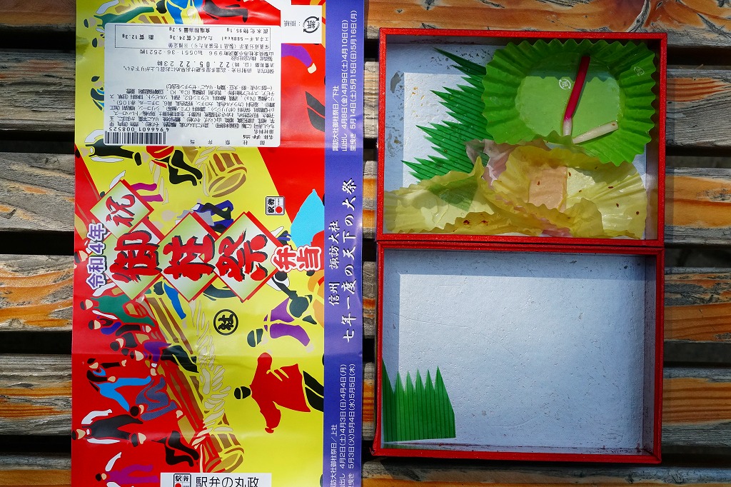 2022(令和4)年5月1日に小淵沢駅と茅野駅で発売。8日までの販売予定を月末まで延長し、6月にも売られた模様。6年ごと、数え年では7年ごとに開催される諏訪大社の御柱祭(おんばしらまつり)に合わせて、2016年以来6年ぶりに再登場。掛紙の絵柄は、6年前とまったく同じ。曜日配列も同じなので祭の日程の表記も変わらず、年号と調製元の表記だけが変わった。おしながきと割りばしと「おんべ」を添える点も変わらない。