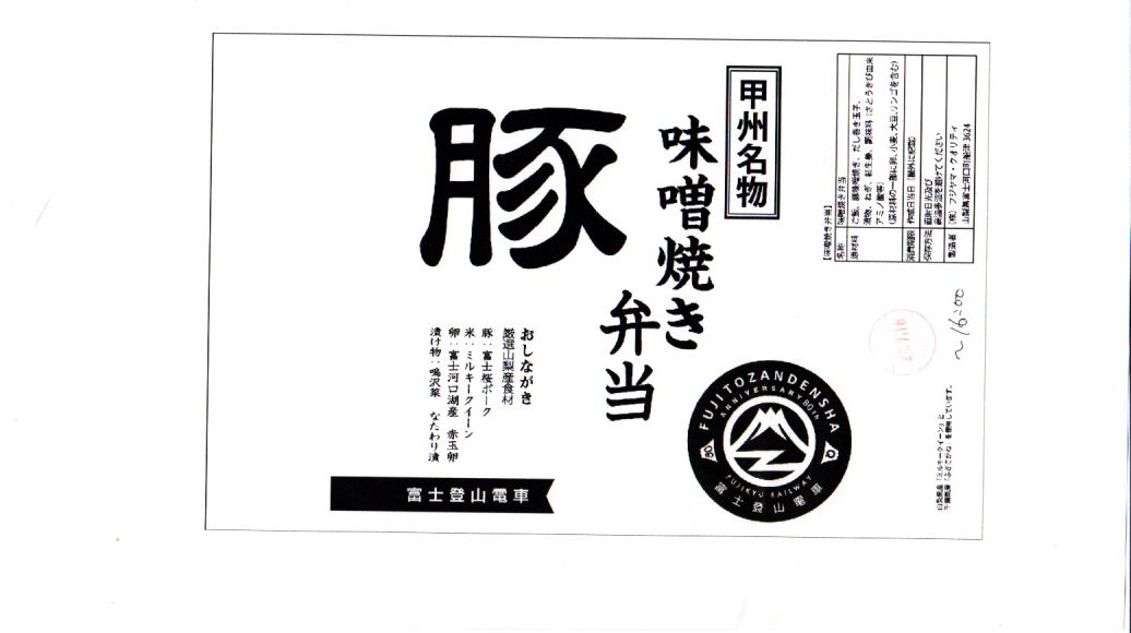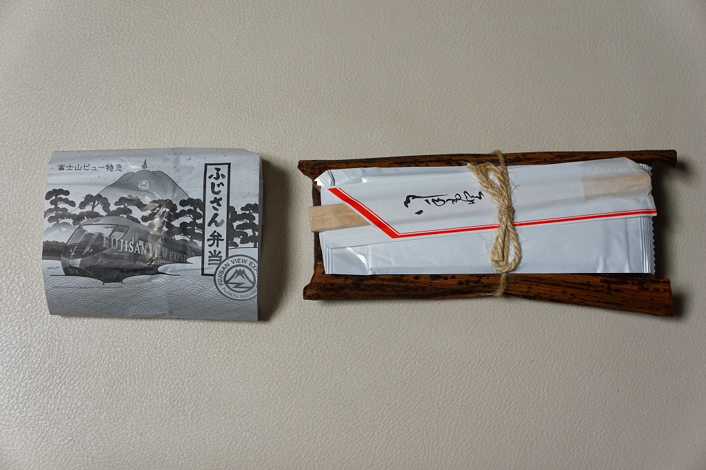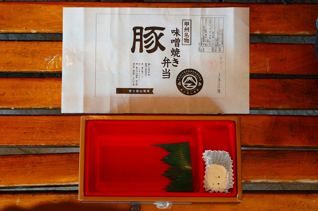 2010(平成22)年3月21日の河口湖駅構内イベント「春の富士急のりものフェスタ」で売られた、富士急行線内では初めての駅弁。ボール紙でできた長方形の箱に透明なふたをして、駅弁の名前やおしながきなどを書いたモノクロの掛紙を巻く。