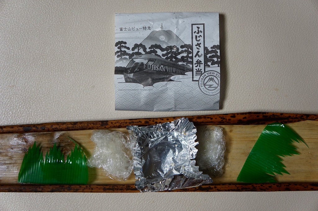 富士急行の観光列車「富士山ビュー特急」の運転開始に合わせて、2016(平成28)年4月23日に発売か。駅ではなく、同列車と「富士登山電車」の車内でのみ売られるお弁当。紅白のおむすびと、焼サバとかまぼこと玉子焼と筑前煮を、竹皮で包み、富士山ビュー特急のイラストを描いた掛紙を巻く。