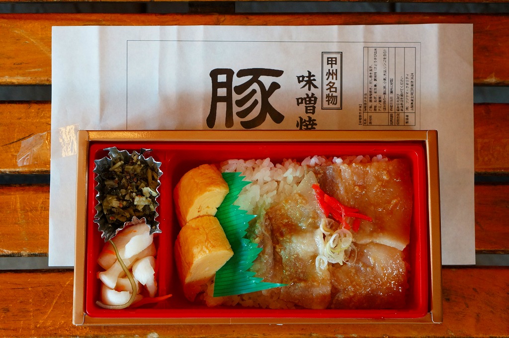 中身はミルキークイーンの白御飯の上にフジザクラポークの味噌焼きを貼り、河口湖産の赤玉卵を使った玉子焼を収め、鳴沢菜のなたわり漬けを添えるもの。山梨県産の食材をふんだんに使ったという。見栄えにこそ工業製品の雰囲気があるが、分量も常温での味もやや上品な感じ。