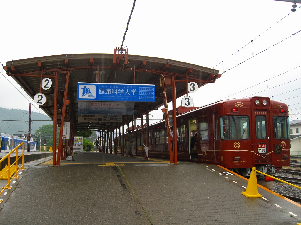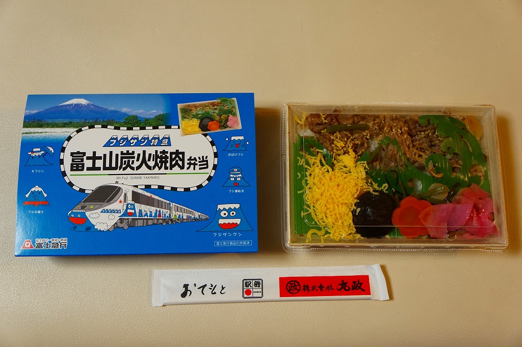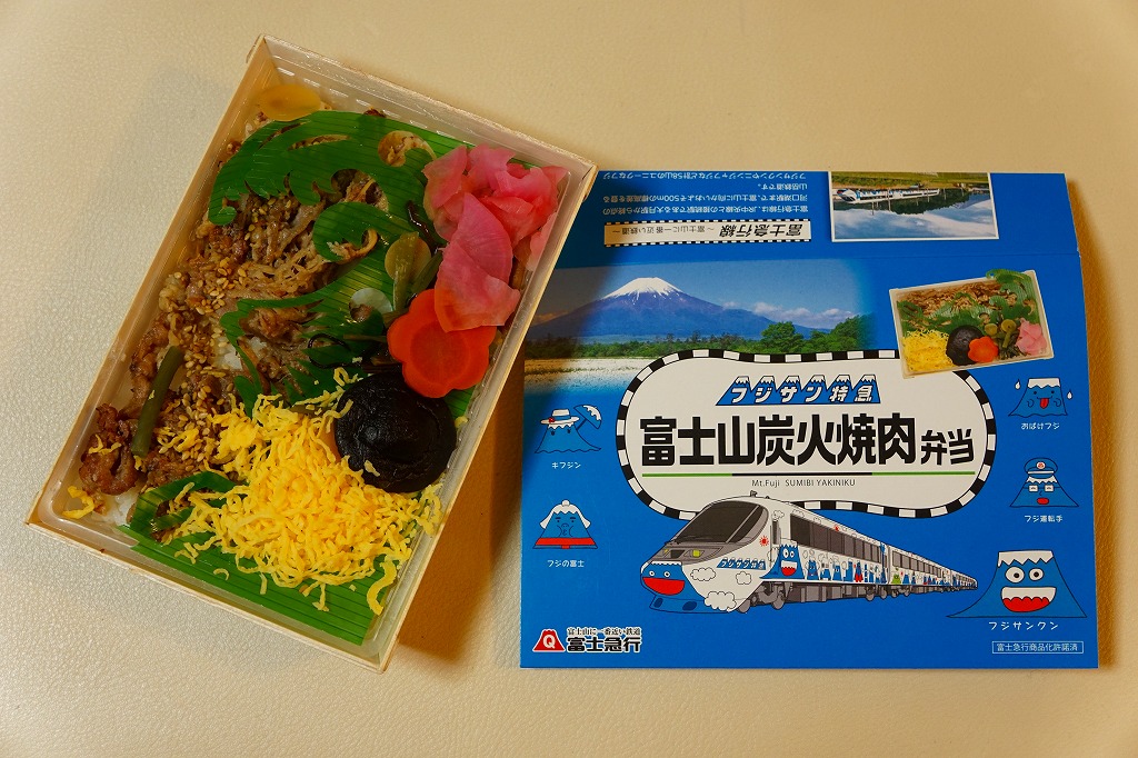 掛紙には「富士登山電車」の文字とマークがある。京王電鉄から買ってきた中古車を、デザイナーを入れて徹底的に車内を改造し、2009年8月に登場した観光列車。車内で駅弁の販売はないが、床や椅子や窓枠に明るい木材を使用した車内、アテンダントの乗務、車窓案内や下吉田駅での観光停車など、富士山麓の鉄道移動を彩る仕掛けが詰まる。