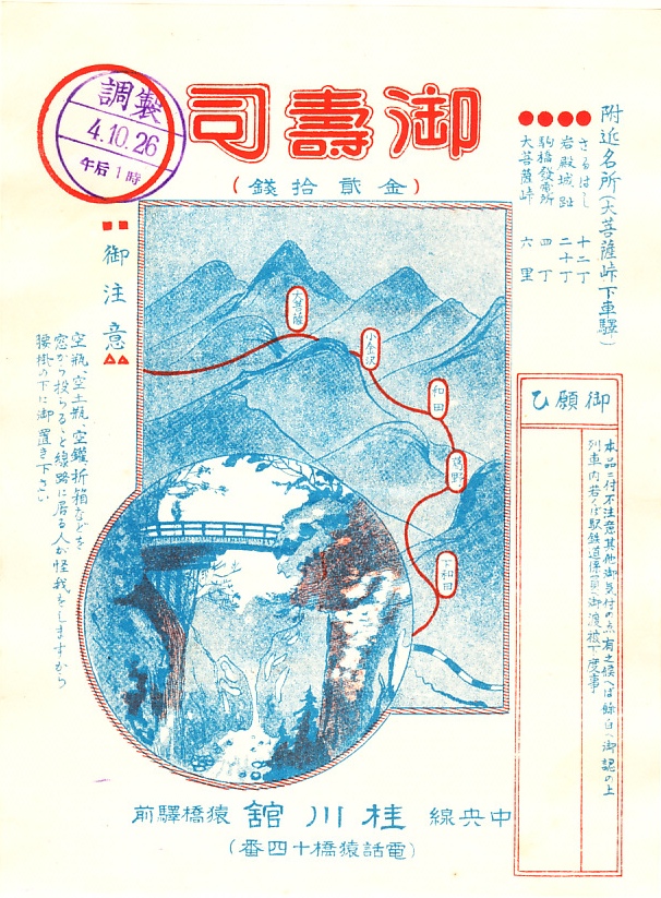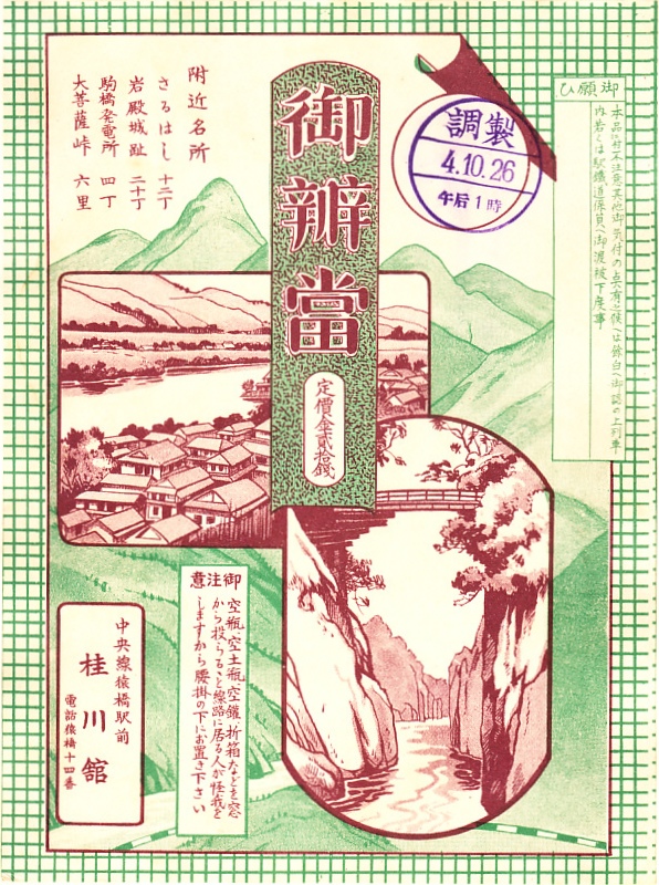1929(昭和4)年10月26日の調製と思われる、昔の猿橋駅弁の掛紙。当時の猿橋と桂川沿いの市街を描いたものか。調製元は猿橋で旅館を営業し駅弁を販売、後に大月駅へ移転し2011年まで駅弁を販売した桂川館。
