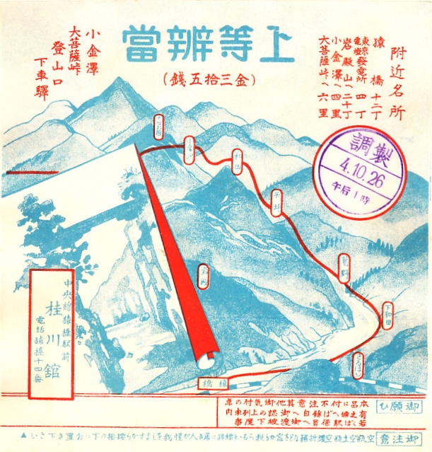 1929(昭和4)年10月26日の調製と思われる、昔の猿橋駅弁の掛紙。同日の「上等御辨當」と同じ、猿橋駅から大菩薩峠に至る登山ルートを控えめに、猿橋を立派に描く。