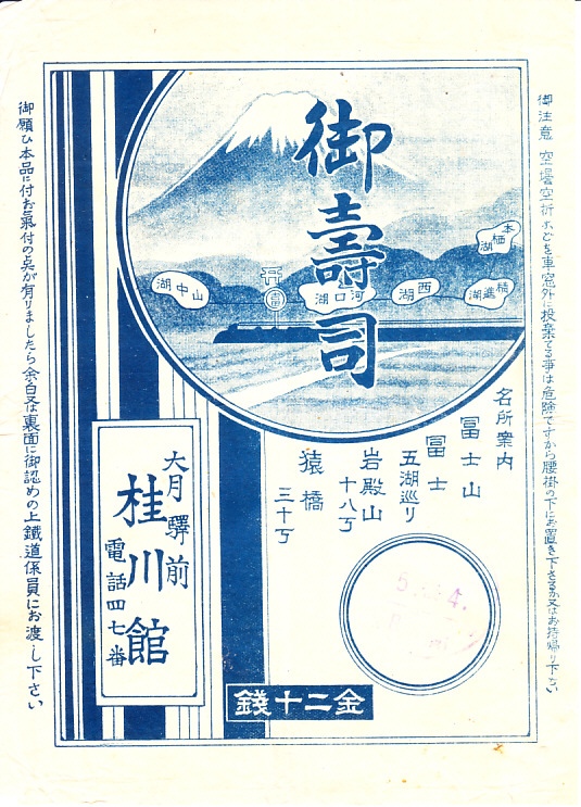 おそらく1930年代の調製と思われる、昔の大月駅弁の掛紙。富士五湖や富士山の絵柄や地名を描く。