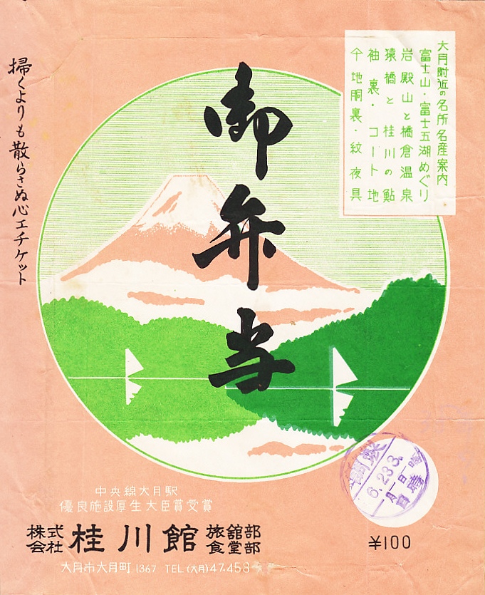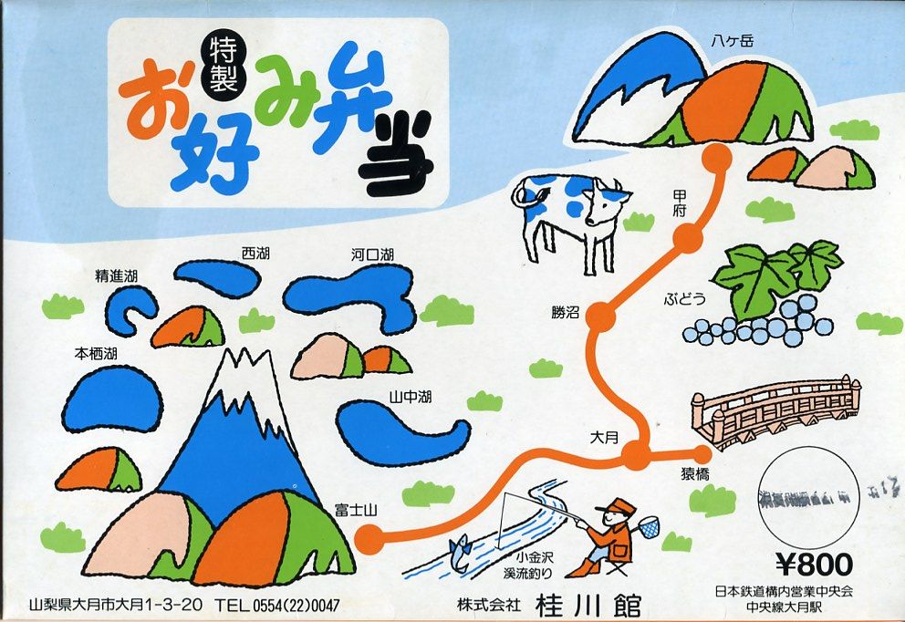昭和30年代、1960年前後の、6月23日3時の調製と思われる、昔の大月駅弁の掛紙。大月付近の名所として、富士山・富士五湖めぐり、岩殿山と橋倉温泉、猿橋と桂川の鮎を挙げるが、湖面に浮かぶ富士山を描くとおり、ここの名所はやっぱり富士である。