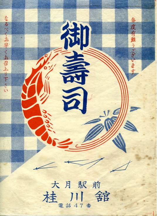 昔のものと思われる、昔の大月駅弁の掛紙。鉄道に関する記述がないため、駅弁でない商品のための掛紙であったのかもしれない。昭和時代まで駅弁屋も、現在のホカ弁やコンビニや持ち帰り寿司チェーンの役割を担っていた。