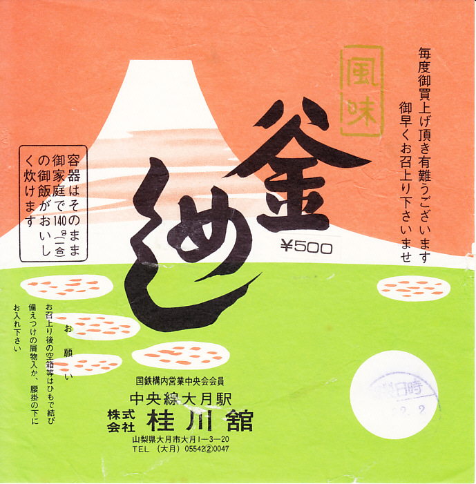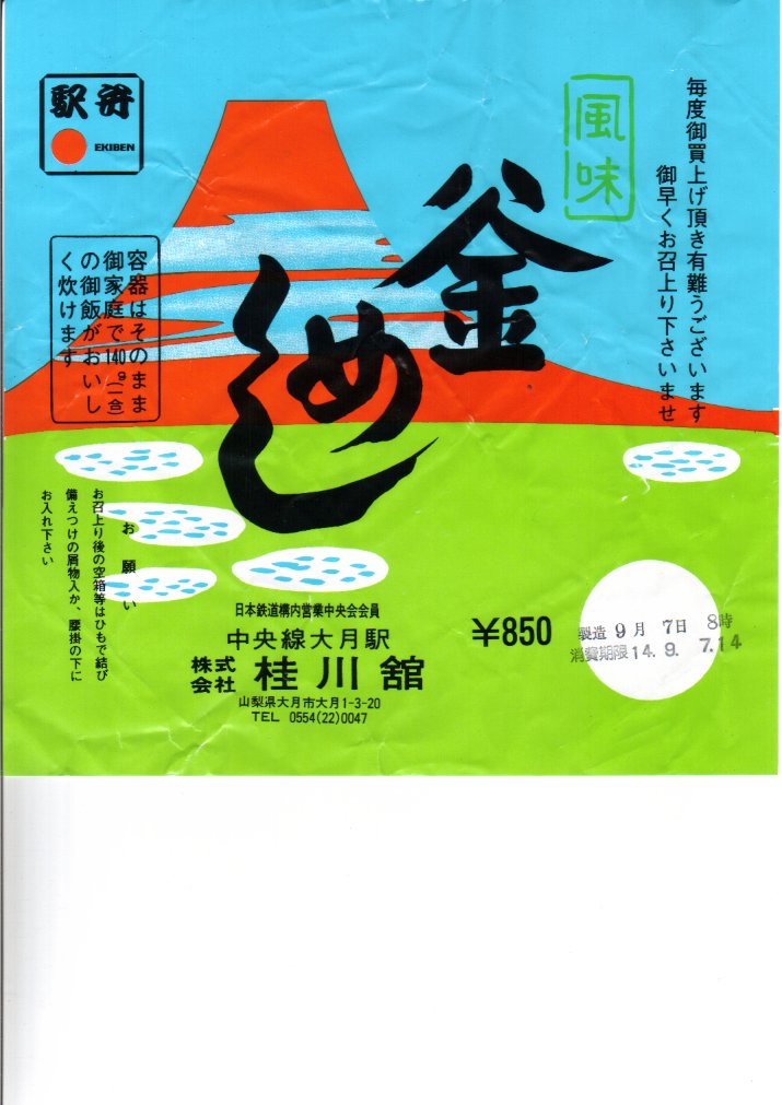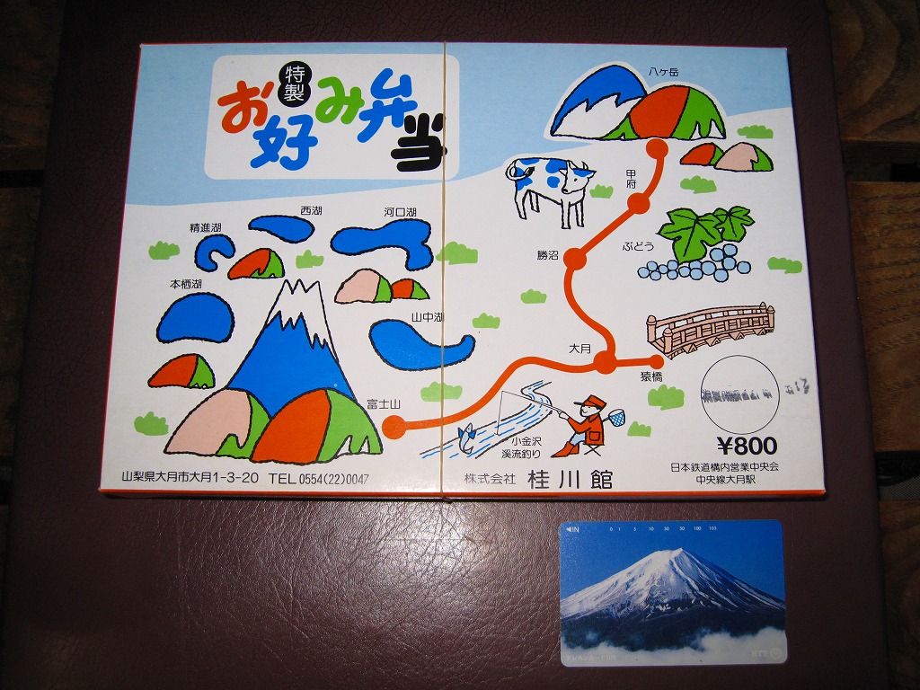 1980年代のものと思われる、昔の大月駅弁の掛紙。色合いと記載内容が少々異なるが、上記の21世紀のものとほぼ変わらない、おそらく何十年も使い続けた、富士山のシルエット。