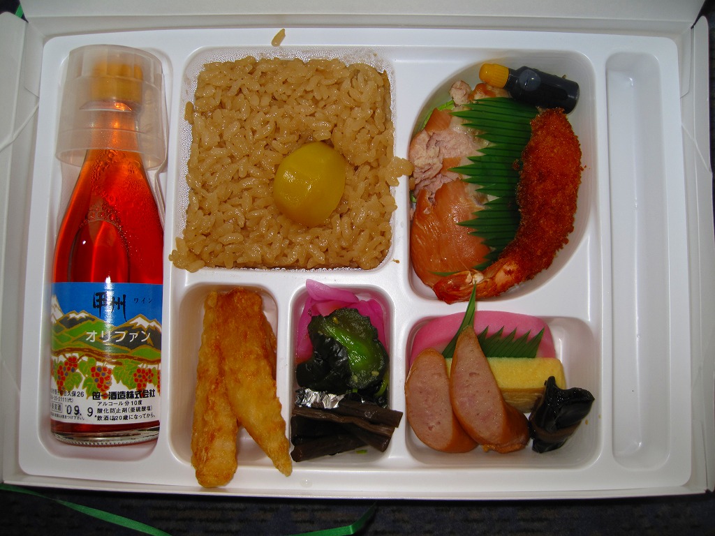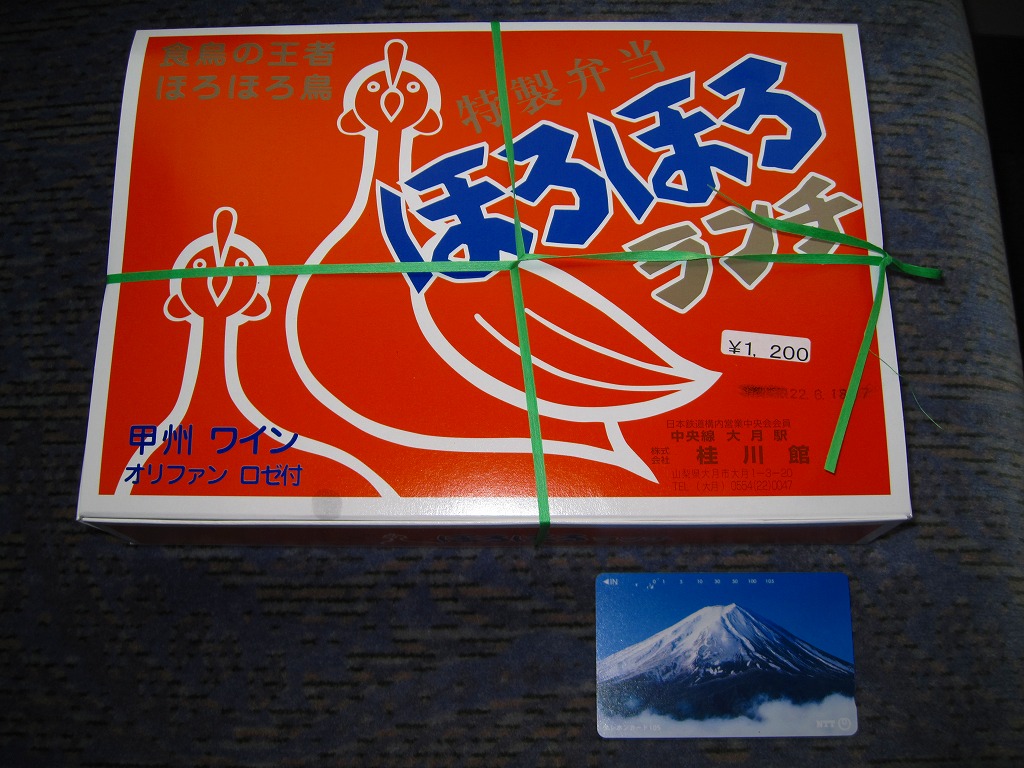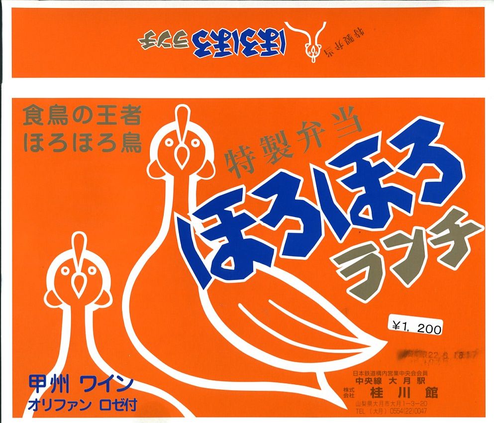 1986(昭和61)年の発売という、ホロホロチョウを使用した全国で唯一の珍駅弁。駅弁の名前や鳥のイラストを描いた専用のボール紙箱を使用、白いプラ製トレーに収まる中身は、栗を添えた味付け御飯に、富士山麓で飼育されているホロホロチョウの薫製、エビフライ、ポテトフライ、ソーセージ、かまぼこ、玉子焼、昆布巻、漬物などと、ロゼの甲州ワイン「オリファン」の小瓶。価格は2002年の購入時で1,150円、2010年の購入時で1,200円。