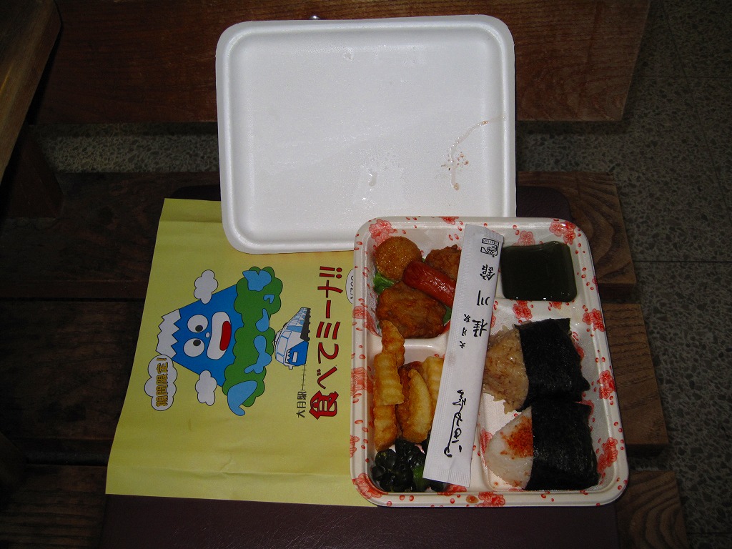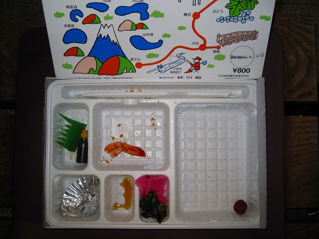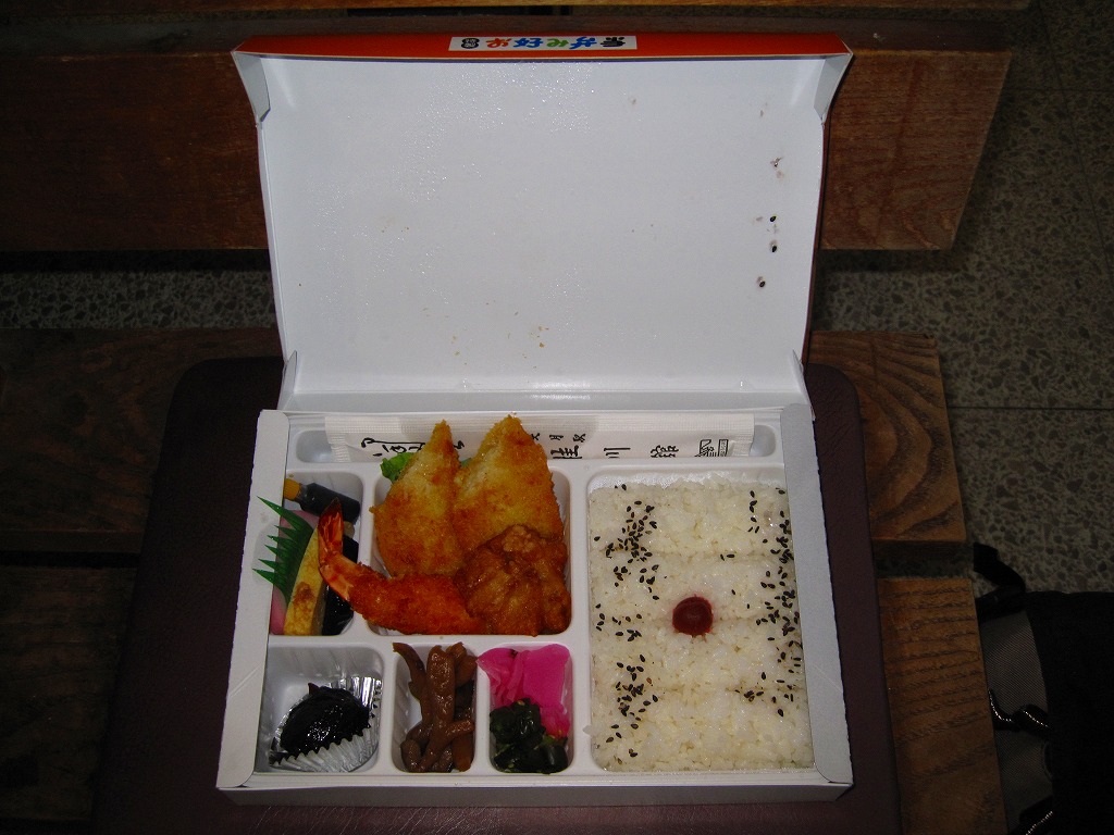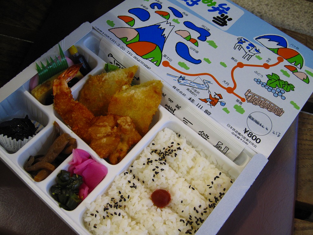 大月駅の幕の内弁当。ボール紙製の専用容器を使用、白いトレーに収まる中身は、日の丸御飯に白身魚フライ、鶏唐揚、エビフライ、カマボコと玉子焼と昆布巻、シメジ、漬物など。おそらく昭和の頃から容器も中身も進化を止めているのだろう、前向きに書けば希少になりつつある、コンビニやホカ弁がなかった頃の古き幕の内駅弁。石和から横浜まで自転車で走っている道中で食べたので、御飯が多く揚げ物ばかりのスタミナ食はうまかった。