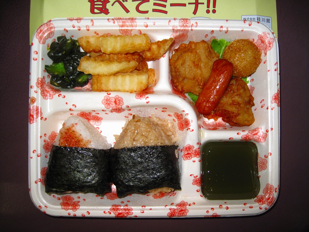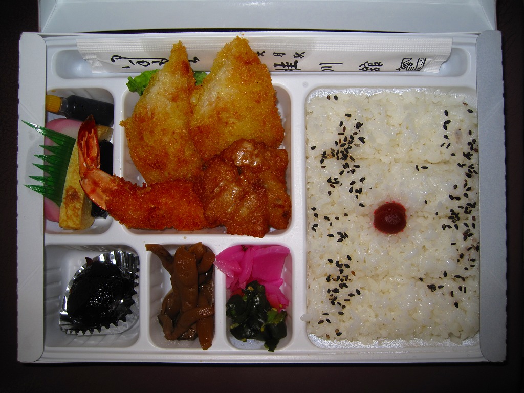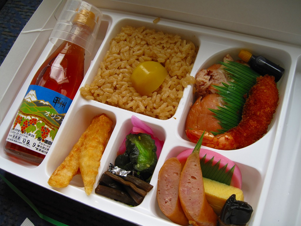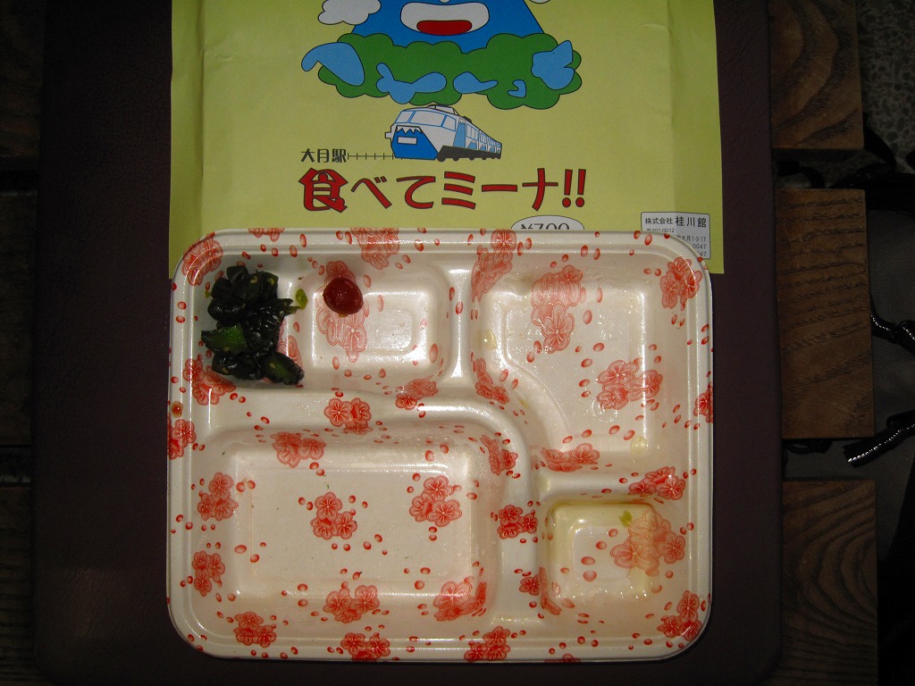 大月駅の幕の内弁当。ボール紙製の専用容器を使用、白いトレーに収まる中身は、日の丸御飯に白身魚フライ、鶏唐揚、エビフライ、カマボコと玉子焼と昆布巻、シメジ、漬物など。おそらく昭和の頃から容器も中身も進化を止めているのだろう、前向きに書けば希少になりつつある、コンビニやホカ弁がなかった頃の古き幕の内駅弁。石和から横浜まで自転車で走っている道中で食べたので、御飯が多く揚げ物ばかりのスタミナ食はうまかった。