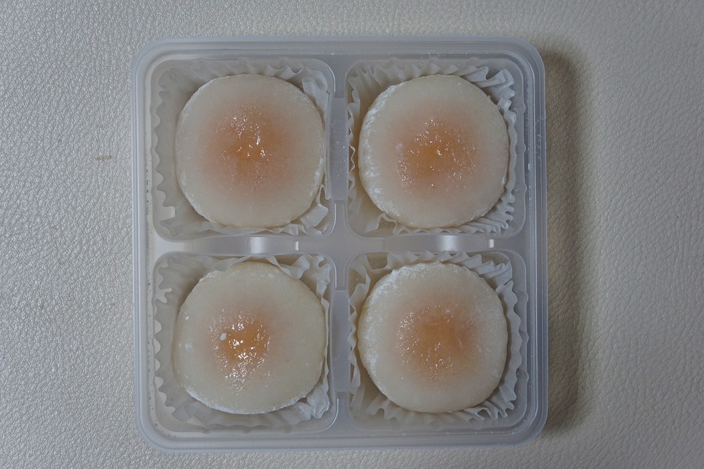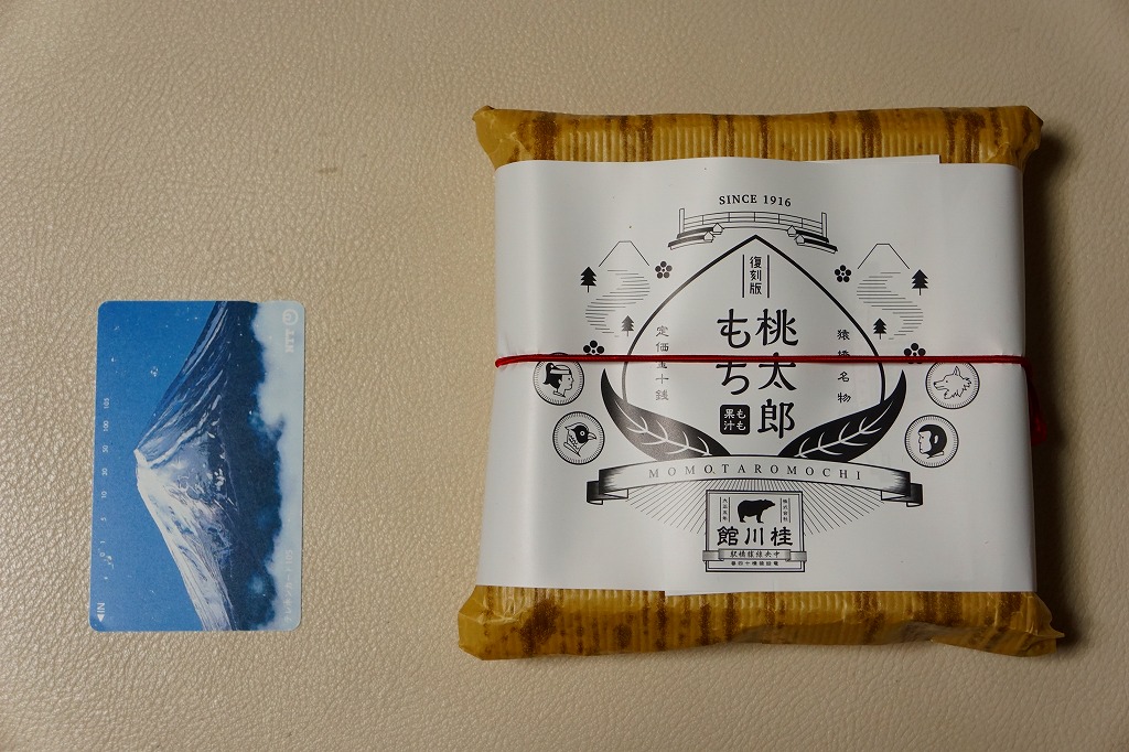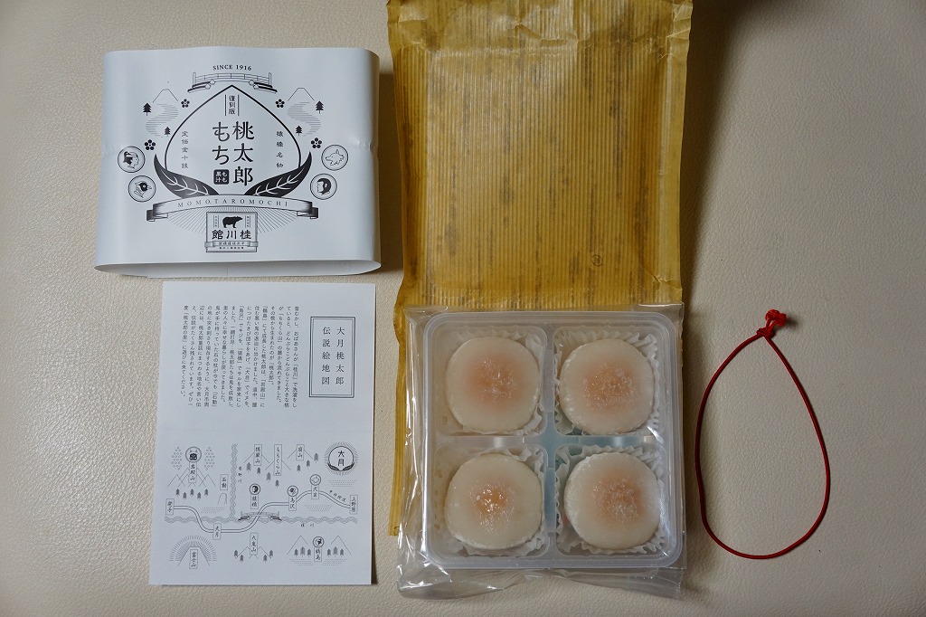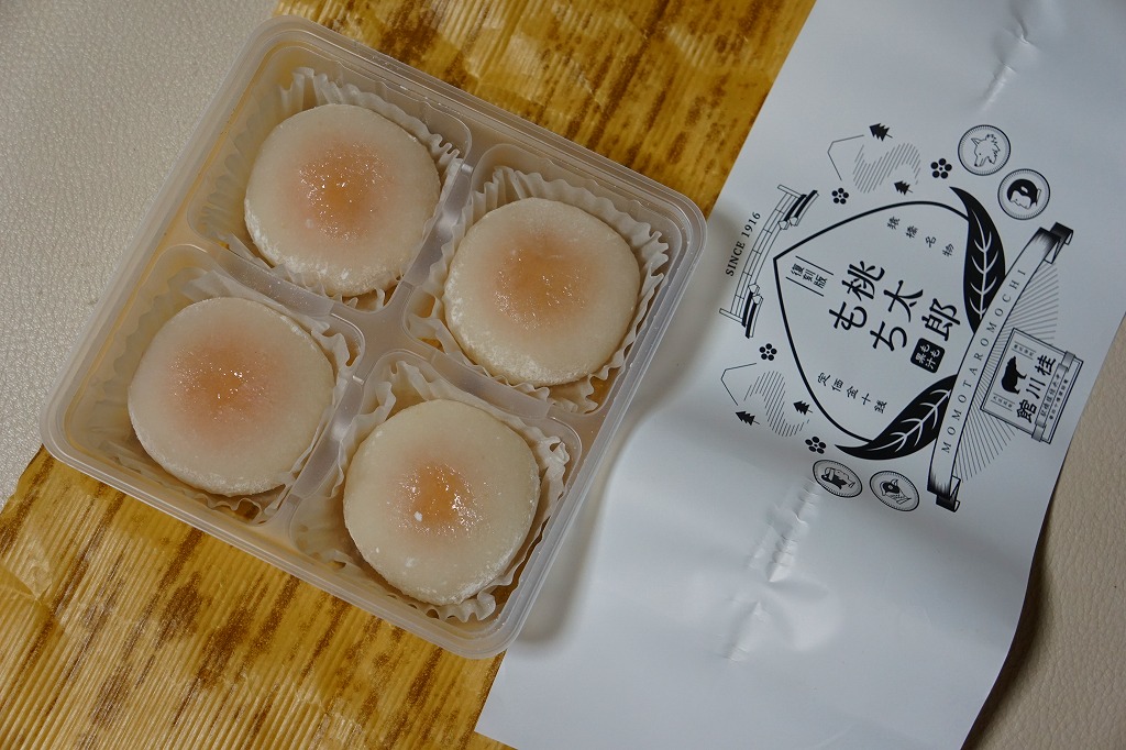 2017(平成29)年4月9日午後に、大月駅にある大月市観光協会の観光案内所で発売。ほのかな桃色に染まる、餅米と白あんと桃シロップ漬を使うプチ大福餅が4個、トレーに収まり、竹皮柄の紙に巻かれ、白くつややかな掛紙に巻かれる。大正時代の猿橋駅で売られた駅売り銘菓の復刻版だというが、それを感じさせない現代的なスイーツ。