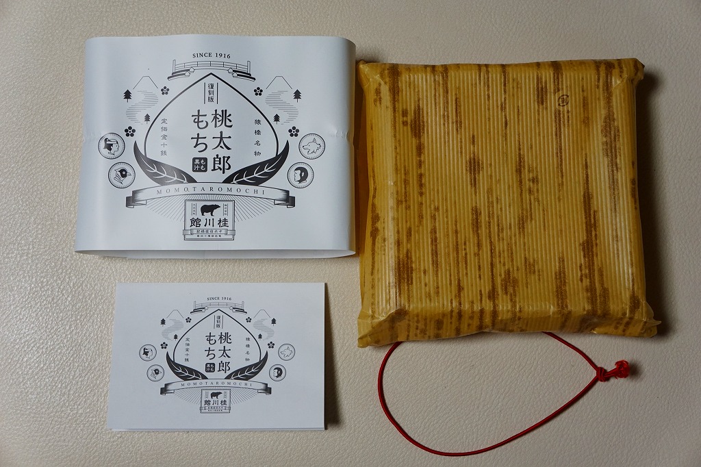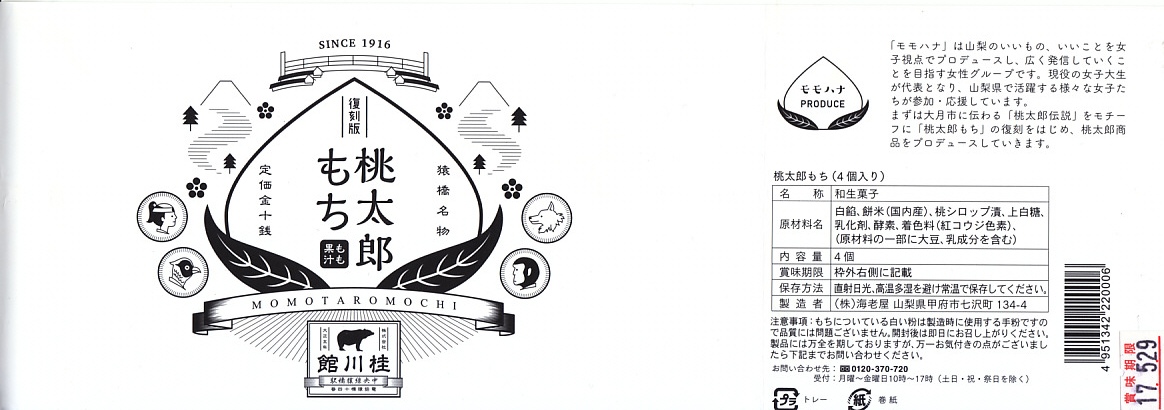 山梨県立大学の総合政策学科の女子学生が、地元の大月に桃太郎に関する伝説があることと、祖先が駅で「桃太郎もち」を売っていたことから、この商品を考案し、販売にこぎつけたという。山梨のよさを発信する女性グループ「モモハナ」が、大正時代の猿橋名物であった桃太郎餅を復刻したという記事もある。掛紙にある「桂川館」は、2011年まで下記の駅弁を販売していた調製元のこと。掛紙上部に「SINCE 1916」とあるとおり、1916(大正5)年に中央線の機関庫があった猿橋駅で駅弁や菓子などを売り始め、富士山麓電気鉄道、現在の富士急行が開業して乗換駅になった大月駅へ移転した。