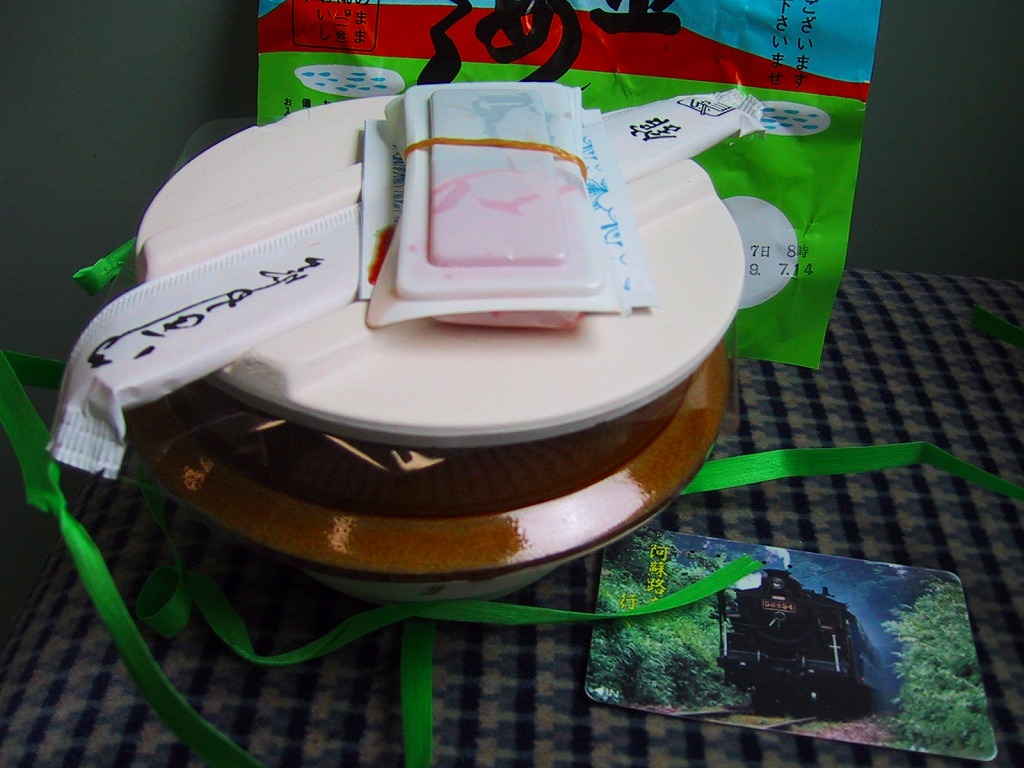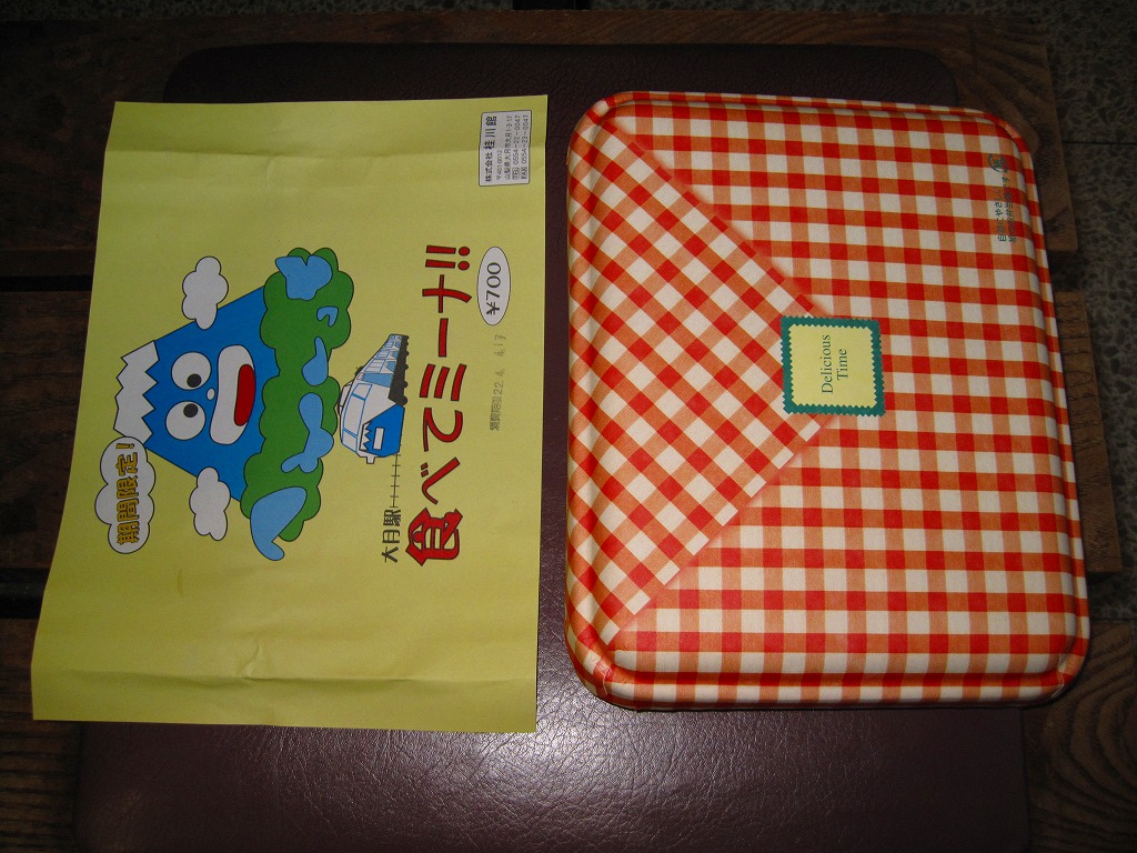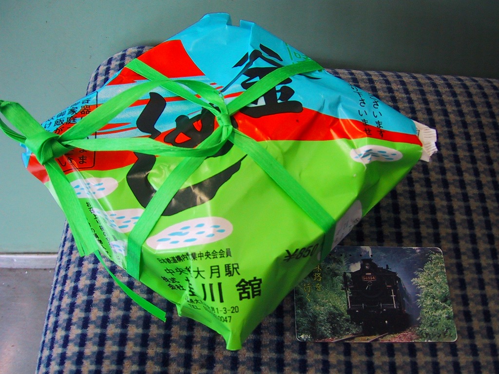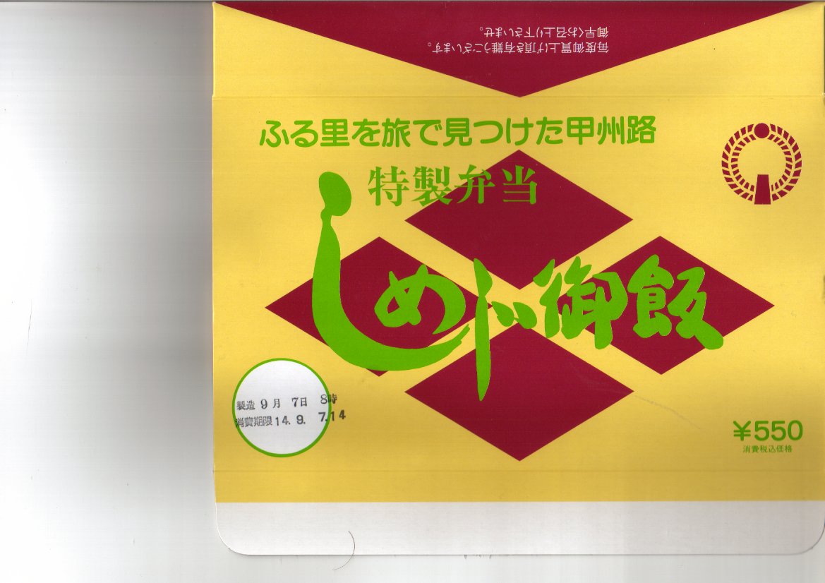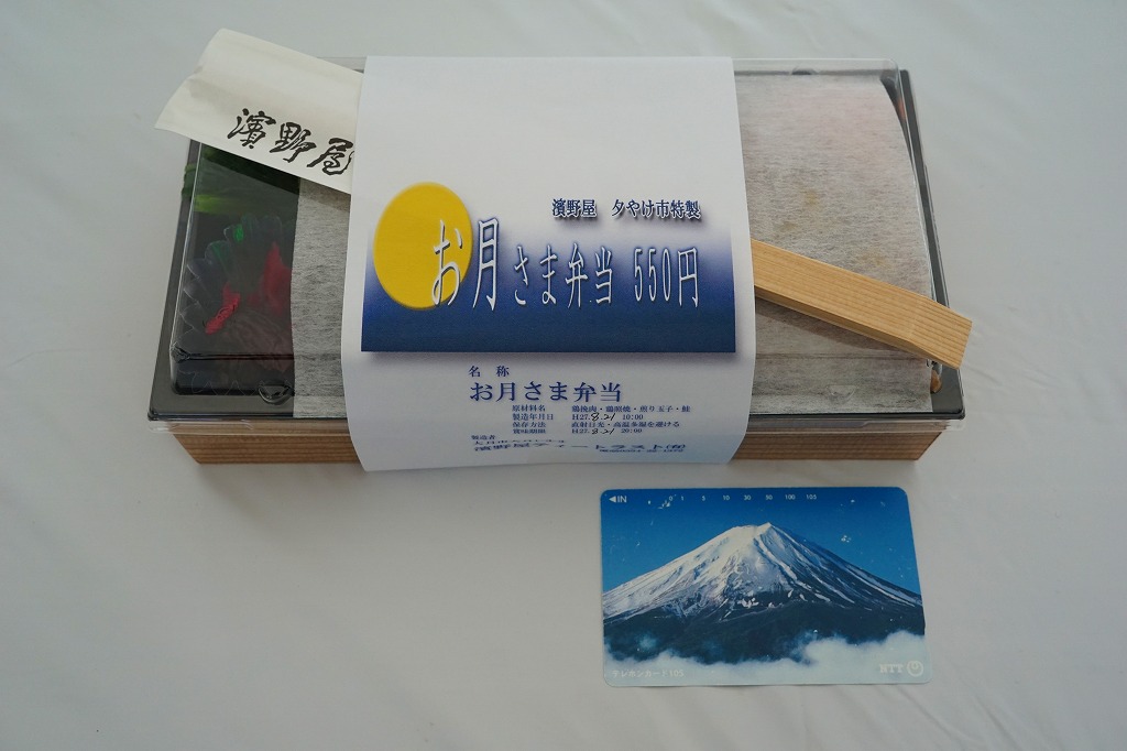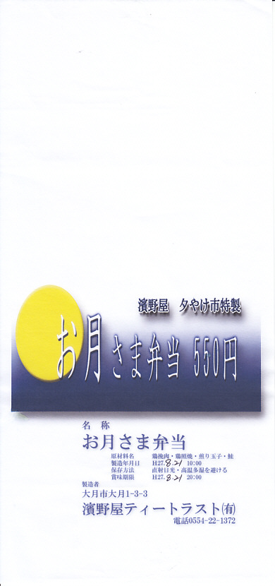 2014(平成26)年の7月までに、大月駅の駅舎の一角にある、大月市観光協会の小さな小さな案内所兼売店で売り始めたお弁当。調製元は1904(明治37)年からの大月の駅前旅館で、この弁当は大月駅前で毎月第三土曜日の日中に実施する「夕やけ市」で販売しているもののようで、掛紙にもそんな表記が見られる。