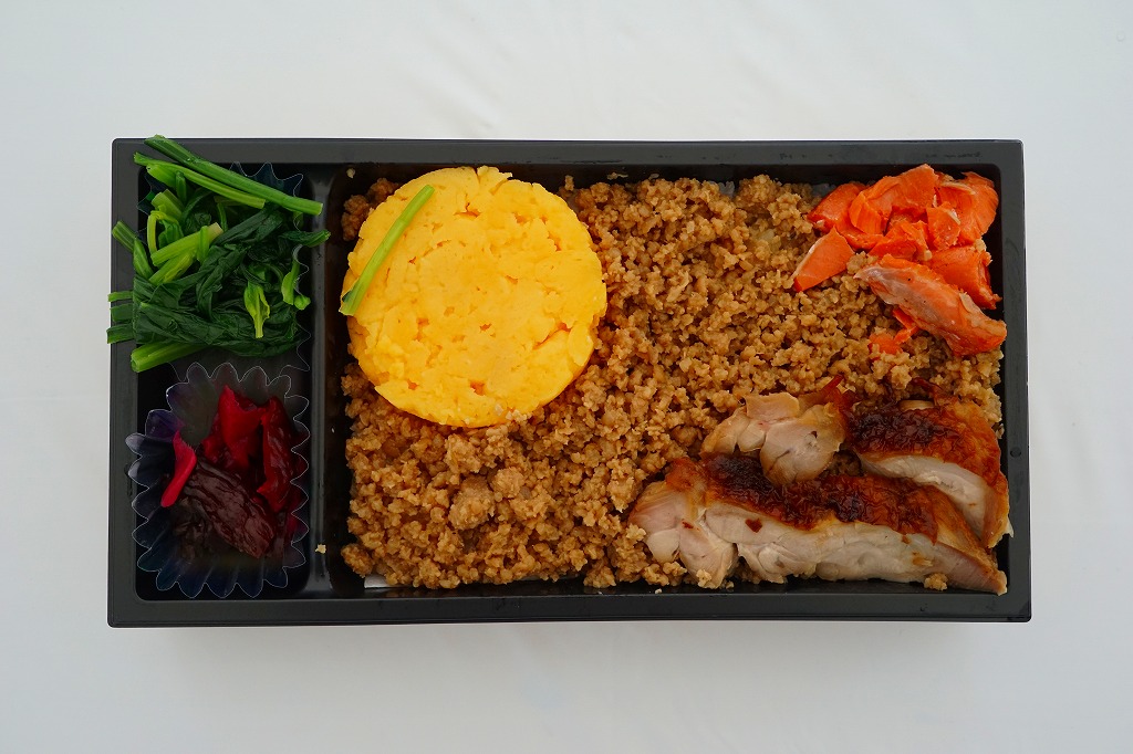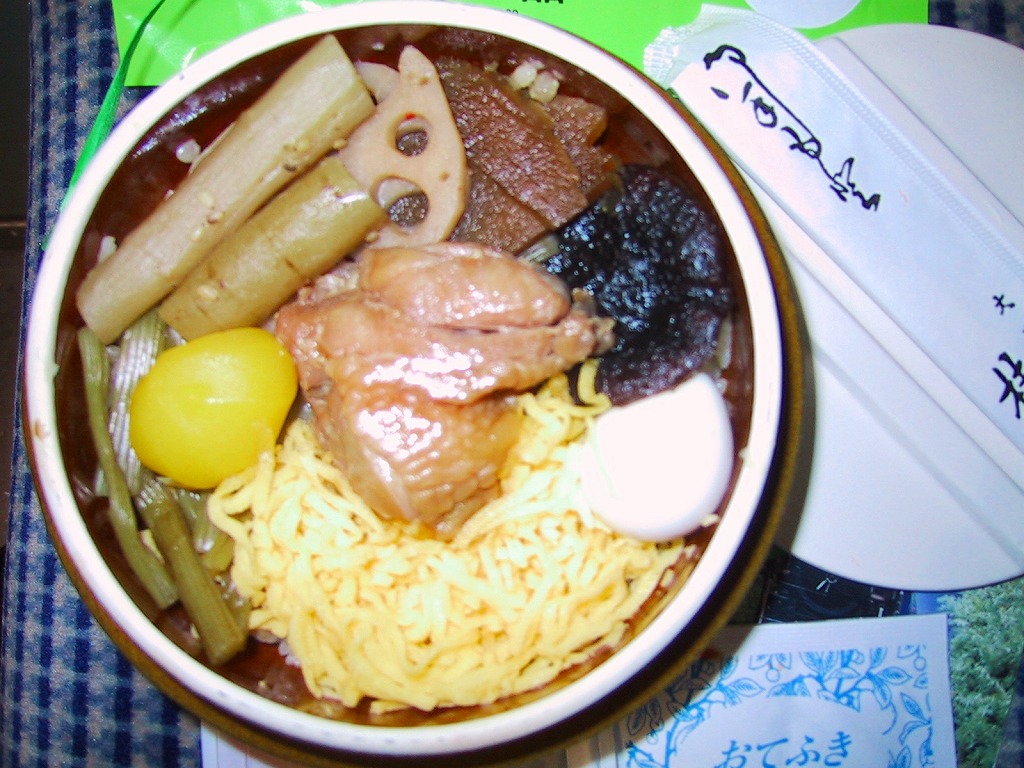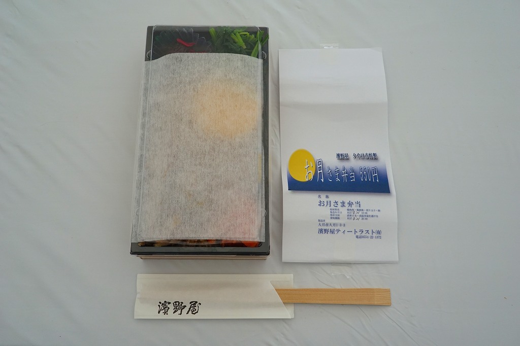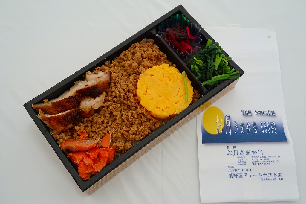 白御飯の上に、真円に固めた炒り卵、鮭フレーク、鶏照焼を配し、隙間を鶏そぼろで埋め、ホウレンソウと柴漬けを添える。御飯の具で満月の夜空を表現しているのだろう。駅弁向けでもありふれたプラ製の容器を使いながら、御飯の底に吸湿シートを敷いており、常温で湿っぽくなく固くなく、適度な口当たりである。安くて柔らかく、きれいなお弁当。駅弁として知られることなく、2015年までの販売か。