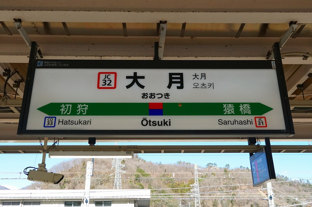 新宿駅から特急列車で約1時間か通勤電車で約1時間半。大月市は山梨県の東部で桂川が流れる、人口約2万人の宿場町。富士への玄関口のひとつで、甲州街道の宿場町が連なるほか、奇矯で知られる猿橋がある。駅弁は1916(大正5)年から売られ、2011(平成23)年に消えた。1902(明治35)年10月1日開業、山梨県大月市大月町1丁目。