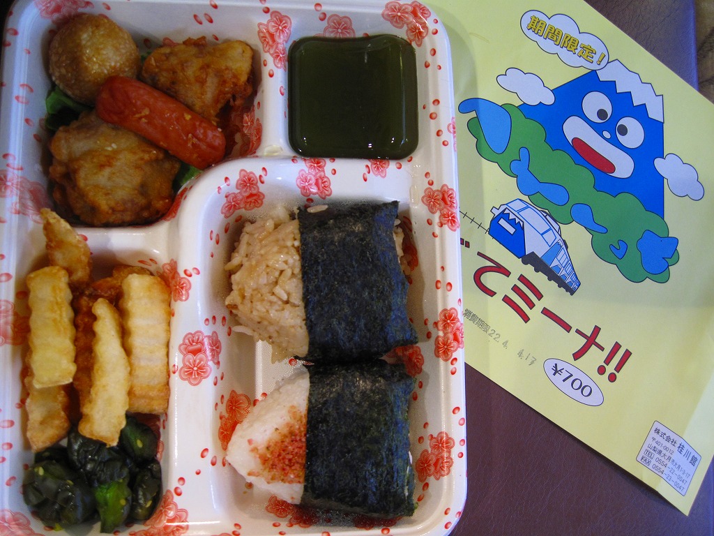 2006(平成18)年に発売の、富士急行とのタイアップ駅弁。駅弁の名前は、2004年7月に富士急ハイランドが導入した絶叫マシン「トンデミーナ」にちなんたのだろうか。ホカ弁タイプの容器に、富士山と富士急行「フジサン特急」のイラストを描いた掛紙をかける。中身はおにぎり2個、フライドポテト、鶏唐揚、ウインナー、ごまだんご、ゼリーなど。どうしてこうなったのか、駅弁や鉄道や遊園地のイメージを損なわないか、見た目も中身も微妙な弁当。発売時にはパンが入ったお子様ランチかピクニック弁当だったそうな。この駅弁はおそらく調製元の廃業により2011年7月限りで失われた。