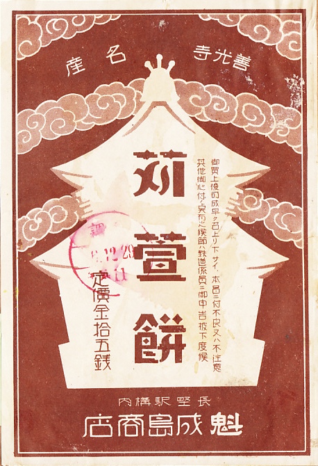 1931(昭和6)年12月29日の調製と思われる、昔の長野駅弁の掛紙。「苅萱餅」(かるかやもち)とあるので、弁当でなく銘菓のたぐいであろう。商品は現存しないようなので、これが何かは分からない。善光寺本堂のように見えるシルエットに商品名を記す。降幡利治「信州の駅弁史」によると、開業時の長野駅では旅館7軒と夏目、成島、丸上の販売人が構内営業を実施、1906(明治39)年に駅長の方針で中島と夏目に弁当類を、成島に雑貨類を販売させた。成島は1932(昭和7)年に営業譲渡したとのことで、この間に販売された商品なのだろう。