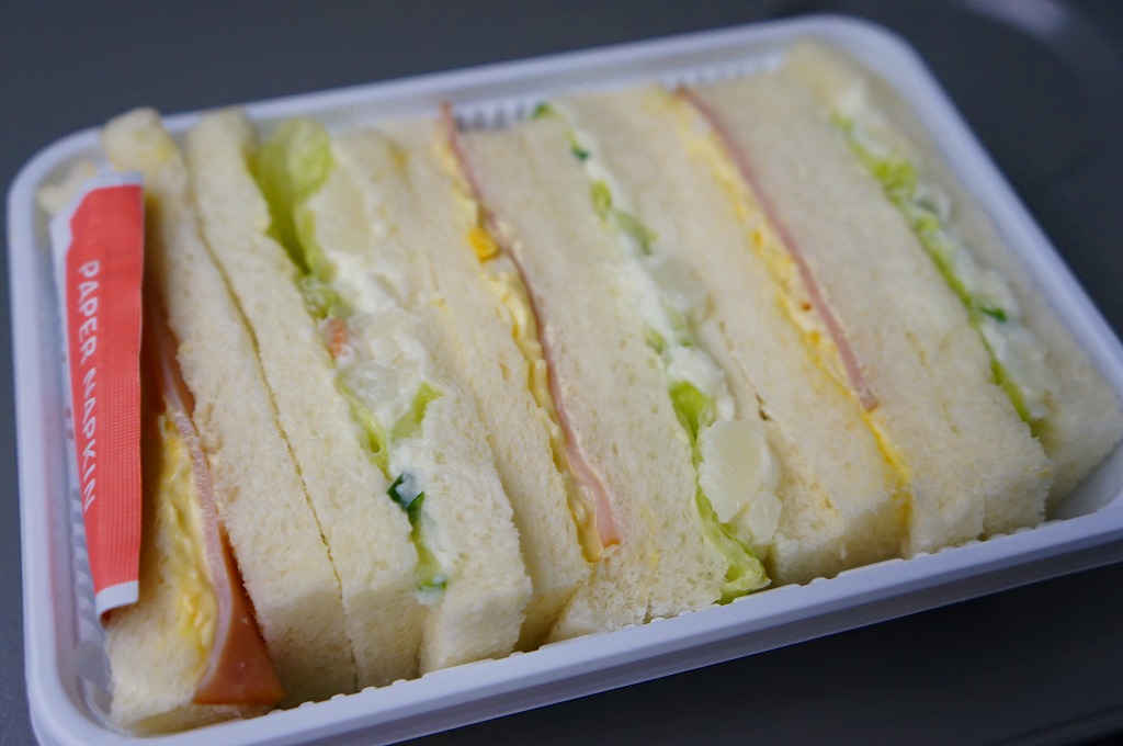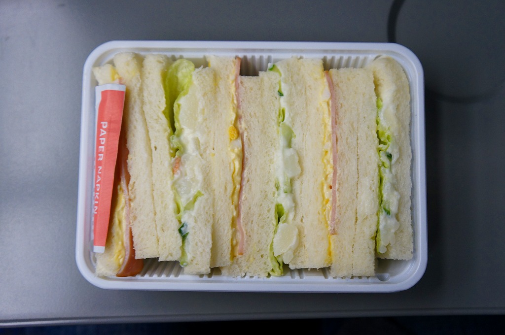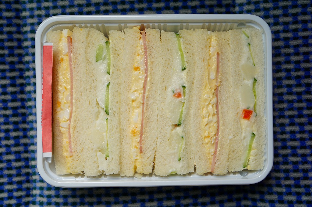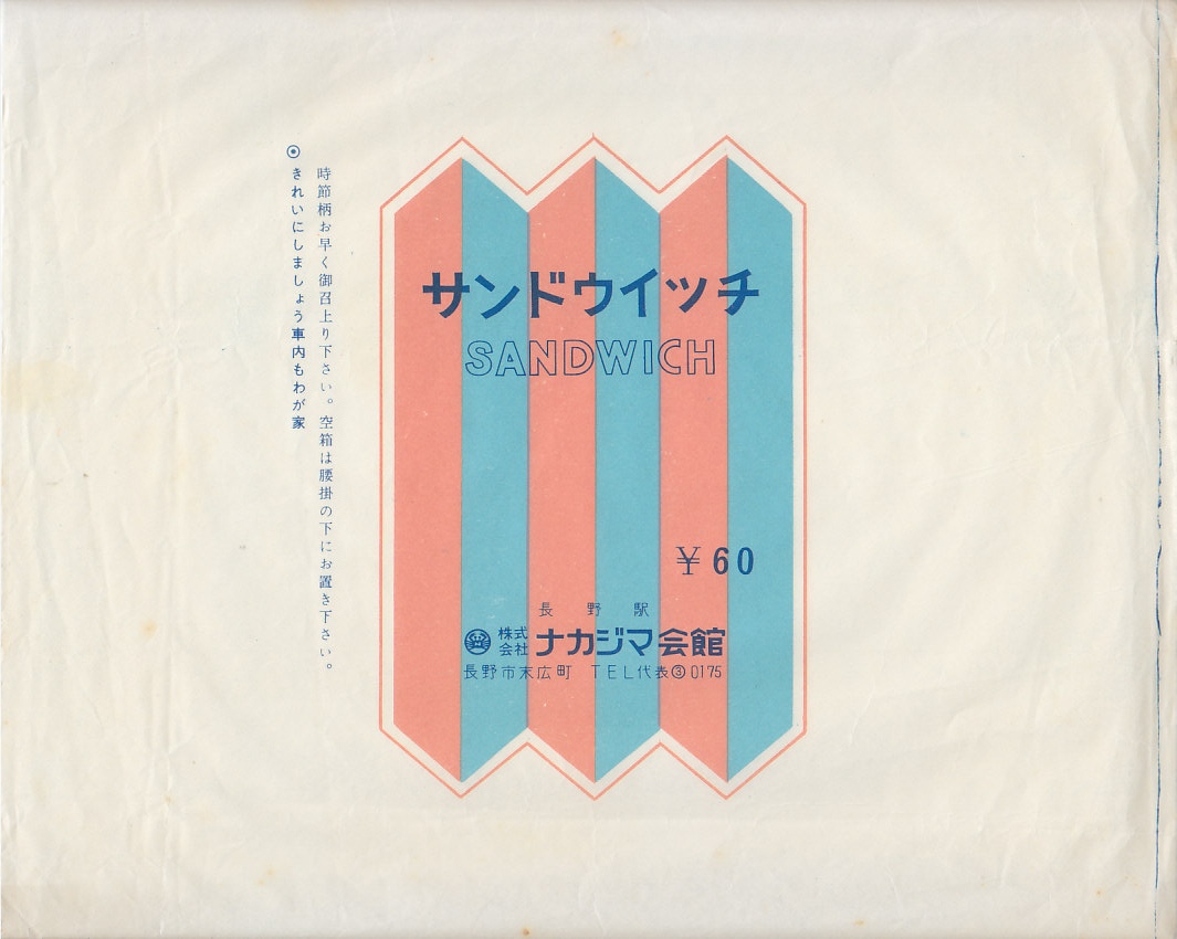 長野新幹線の車内販売で買えたサンドイッチ。ハム玉子サンドとポテトきゅうりサンドが3切れずつ、サンドイッチ向けプラ製容器に収まるという、街の中でも車内販売でも惣菜としてどこでも買えるタイプのサンドイッチ。調製元が115年間もの長きに渡り長野駅の駅弁屋であったものの2007年1月に撤退したナカジマ会館と似た社名を持つところが大いに気になったが、はたして何らかの関係があるのだろうか。長野駅の売店では、この商品は見掛けなかった。