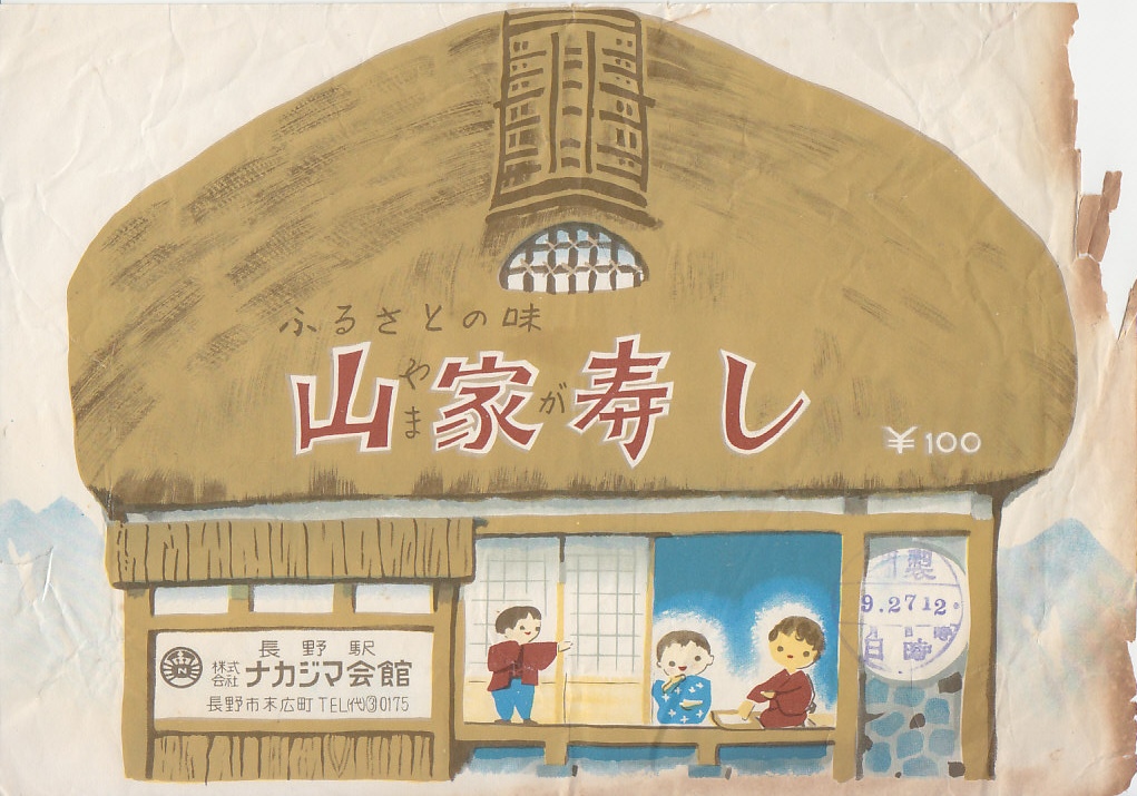 1960年代の、9月27日12時の調製と思われる、昔の長野駅弁の掛紙。山家ずしは1960年代から1970年代にかけて売られた長野駅弁で、山家の形をした容器に山ごぼうの海苔巻きやいなりずしと、山菜や鶏肉などのちらしずしを詰めた、山の幸の駅弁だった。