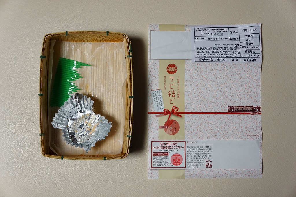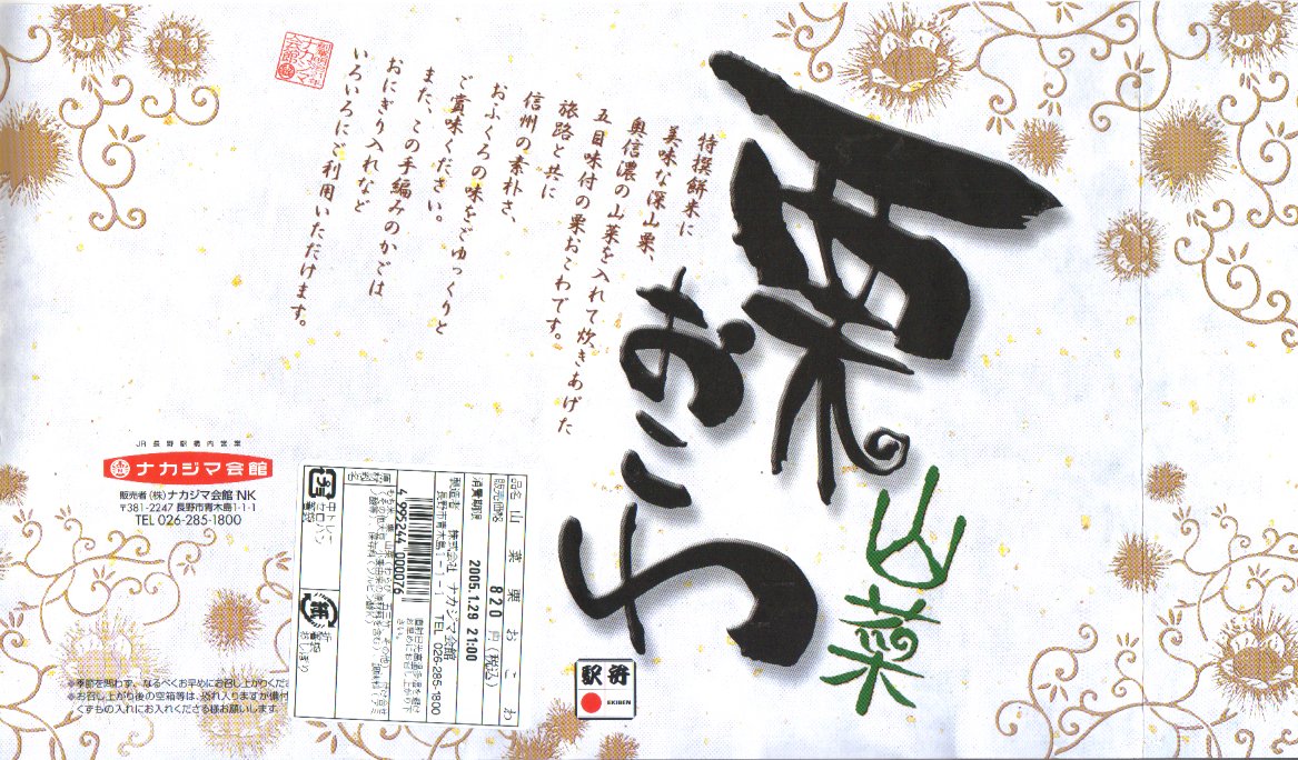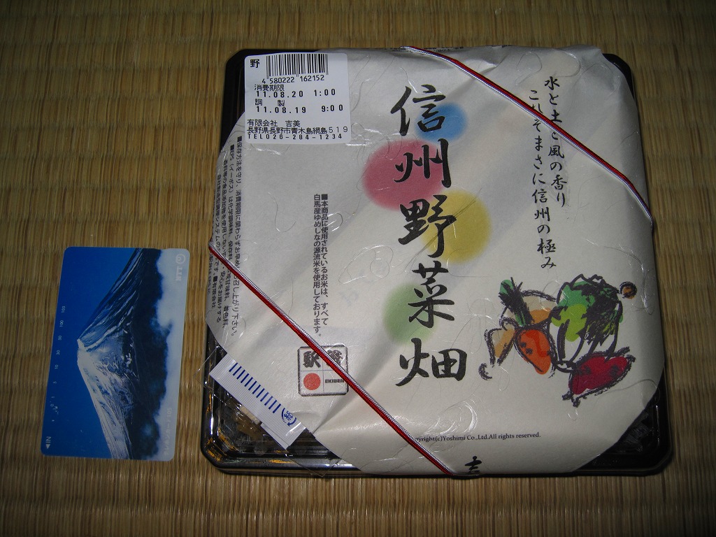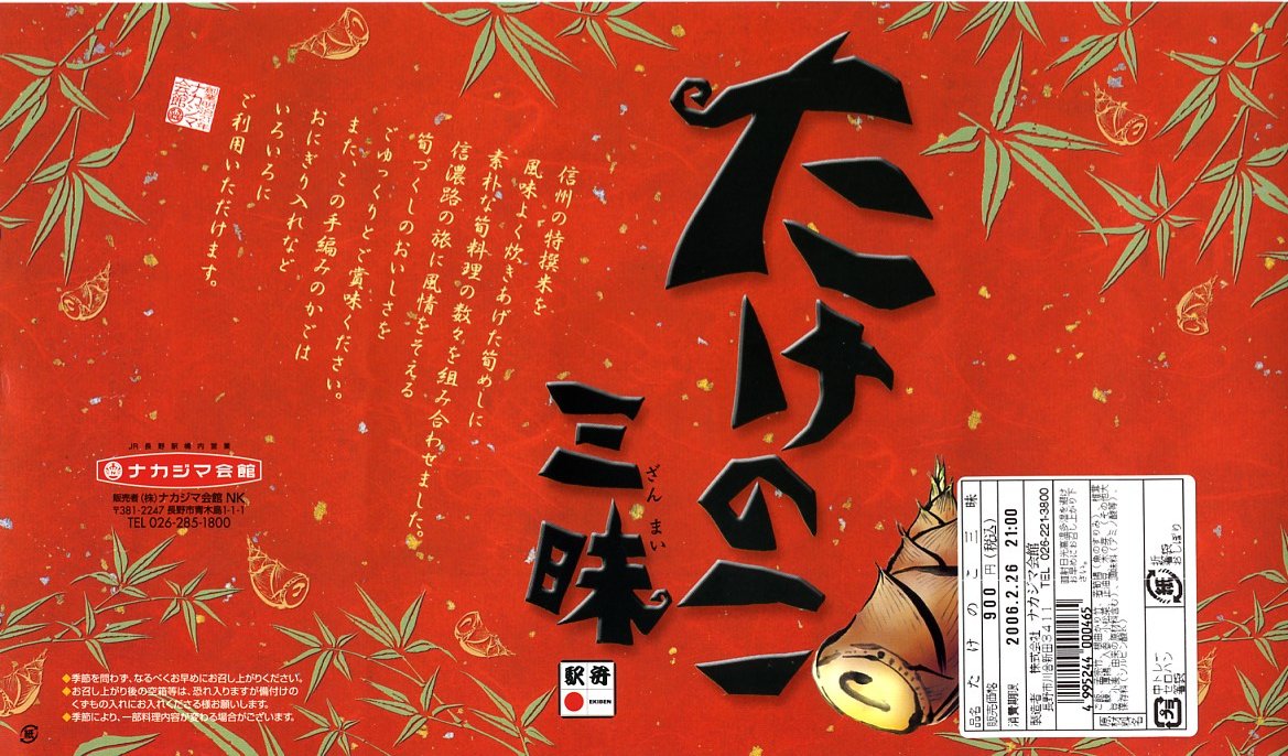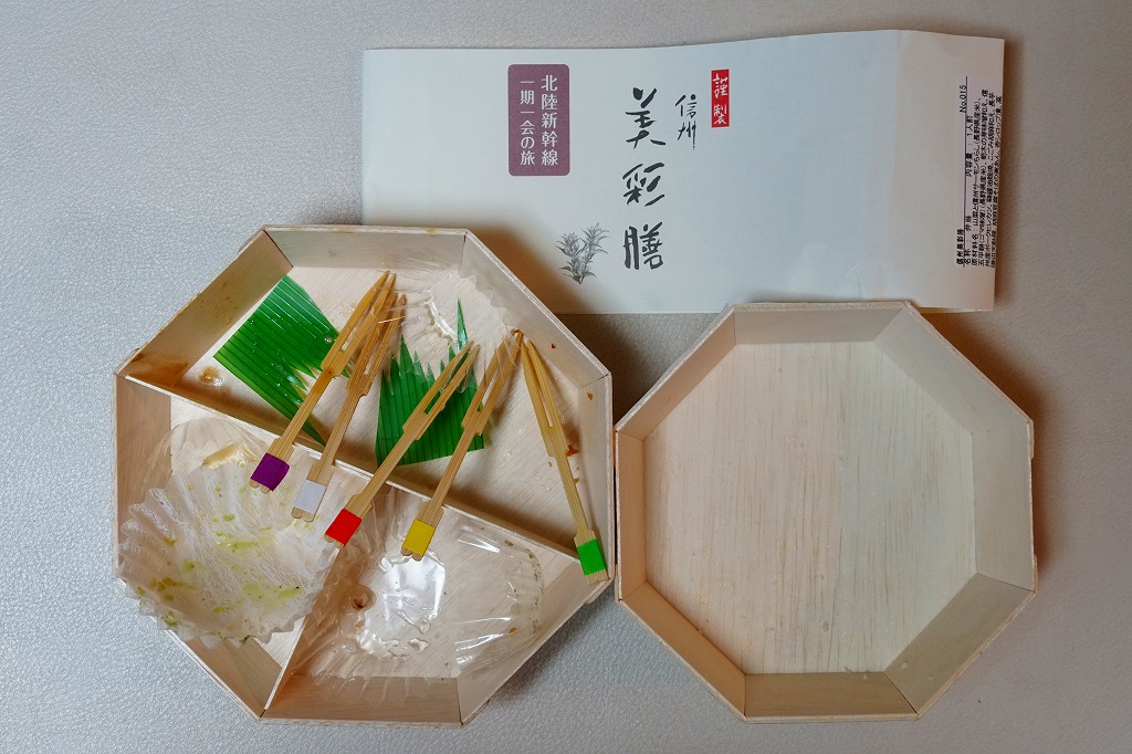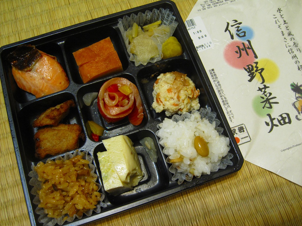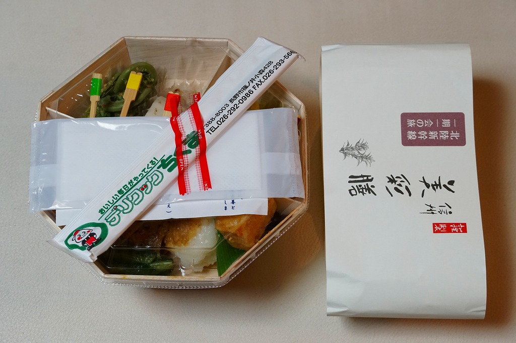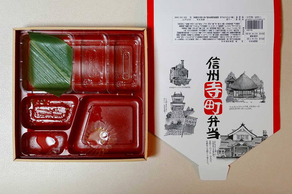 長野駅は1997年10月の長野新幹線開業に伴い、善光寺を模した重厚な駅舎が取り壊されて変哲のない橋上駅に変えられたが、駅弁には山の田舎の雰囲気が見た目で残るものが多いと思う。簡素以上過剰以下な包装がその雰囲気を出す。