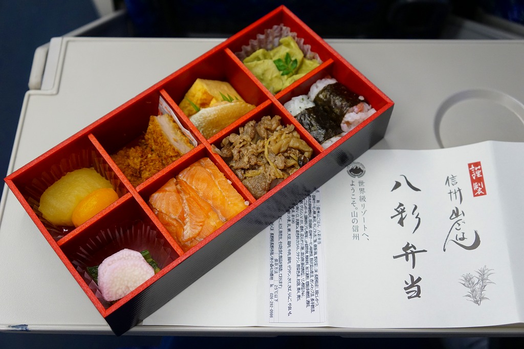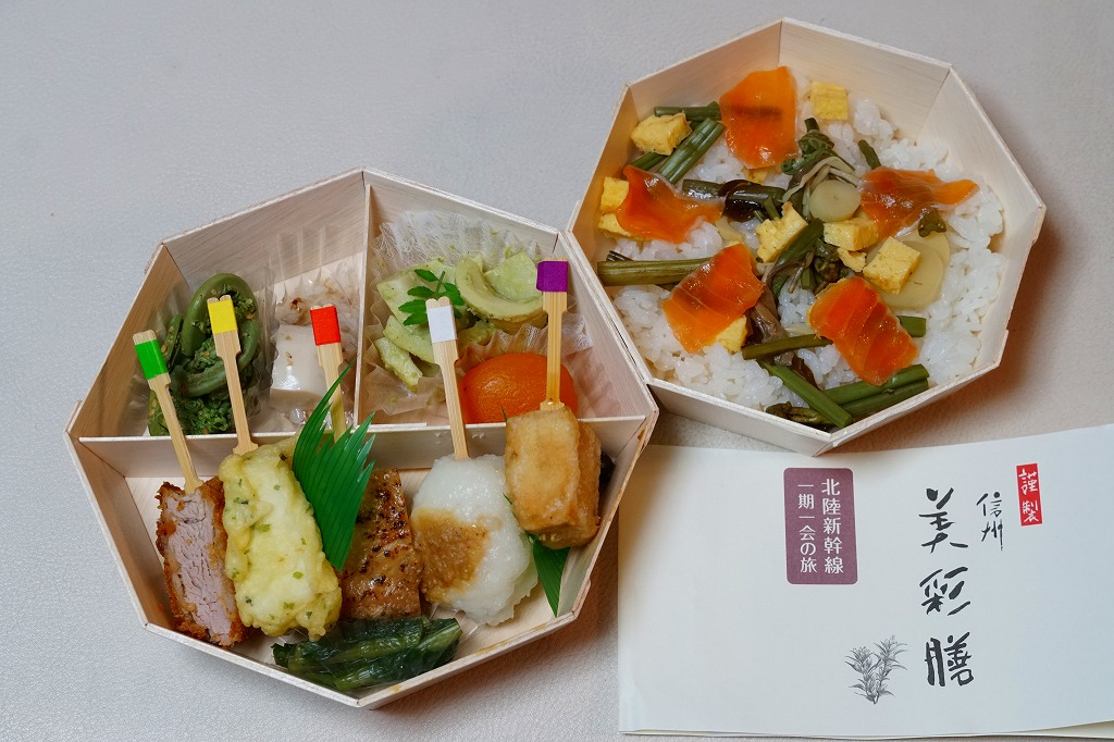 2017(平成29)年7月から9月までのJRグループの観光キャンペーン「信州デスティネーションキャンペーン」の開催に合わせ、その期間中に販売された。8区画の中身は、梅と野沢菜の俵むすび、信州サーモン押し寿司、信州産牛の時雨煮の御飯、信州サーモン味噌焼と厚焼き玉子、信州ポークカツ、タケノコの木の芽味噌和え、野沢菜のわさび漬けとナガイモの酢漬け、りんごのコンポートとあんずシロップ。よくあるタイプのなんでもまるごと駅弁も、見た目が美しく、味もまた美しく。