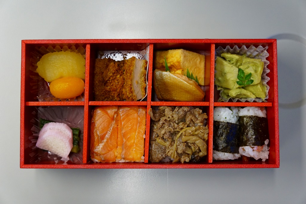 長野の善光寺の御開帳などの際に前立本尊(まえだちほんぞん)と結ばれる「善の綱」と重ね合わせたという中身は、上の「一の段」に上段に5種の串やゼンマイやタケノコなど、下の「二の段」にサーモンと山菜のちらしずし。これは美しいお弁当で、その見た目と同じくらい、味も上品。価格は2015年の発売時で1,100円、2023年時点で1,300円、2024年10月時点で1,600円。