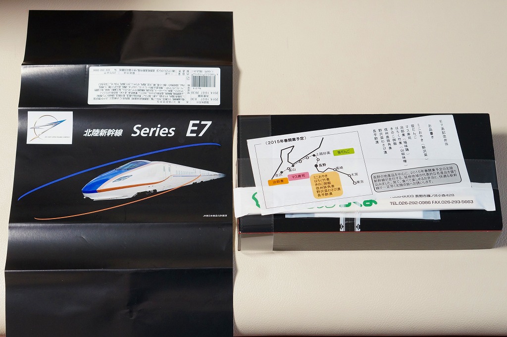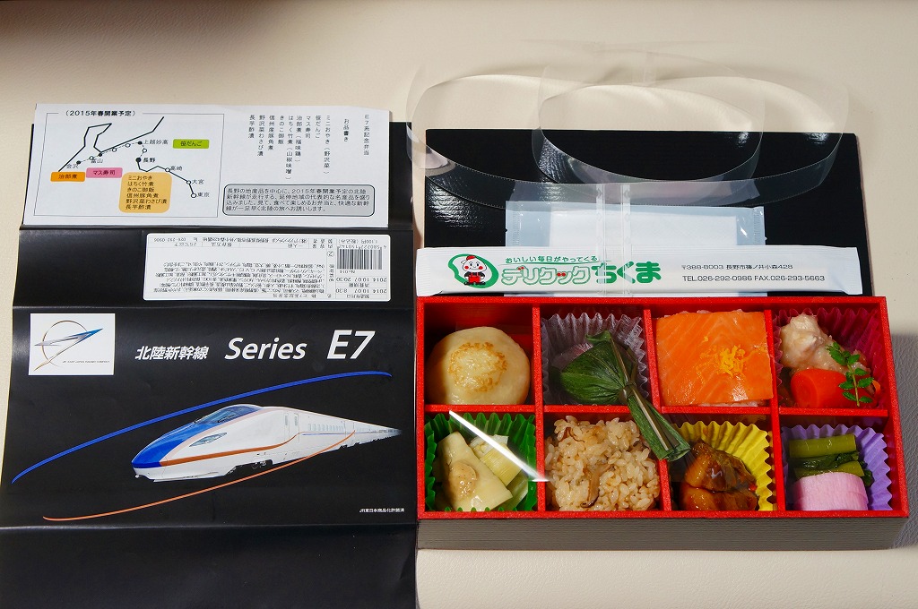 北陸新幹線は2015(平成27)年3月14日に開業。正しくは、北陸新幹線の高崎駅から長野駅までの間は、1997(平成9)年10月に開業していたものの、北陸地方に達していないため駅や時刻表では「長野新幹線」と呼び、これが長野駅から金沢駅までの開業で呼び名と公式な名前を合わせたもの。この延伸開業に向けて、JR東日本E7系電車とJR西日本W7系電車を製造した。E7系は金沢駅までの開業を前に、2014(平成26)年3月14日のダイヤ改正で東京駅と長野駅を結ぶ「あさま」一部列車で営業運転を開始、その日からいわゆる北陸新幹線の開業までが、この駅弁の販売期間であった。