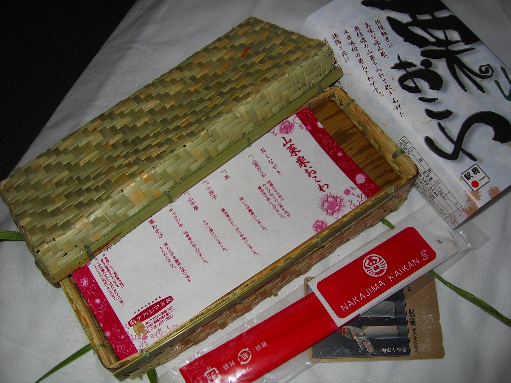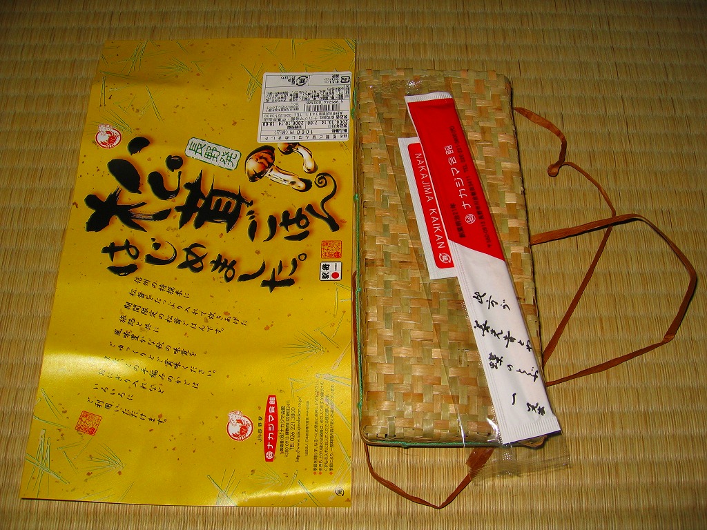 2003(平成15)年に発売か。細長い竹編み容器に割り箸を載せて、商品名を記した朱色の掛紙を巻き、紙ひもで十字にしばる。ふたを開けると緑色のお品書きが登場。中身はタケノコ御飯に焼きタケノコを載せて、ニシンとタケノコの旨煮、タケノコの味噌挟み、タケノコの魚すり身巻き揚げなど、おかずにもタケノコをいろいろ使い、醤油豆を添える。