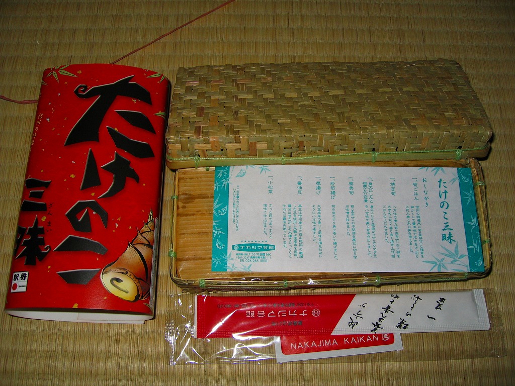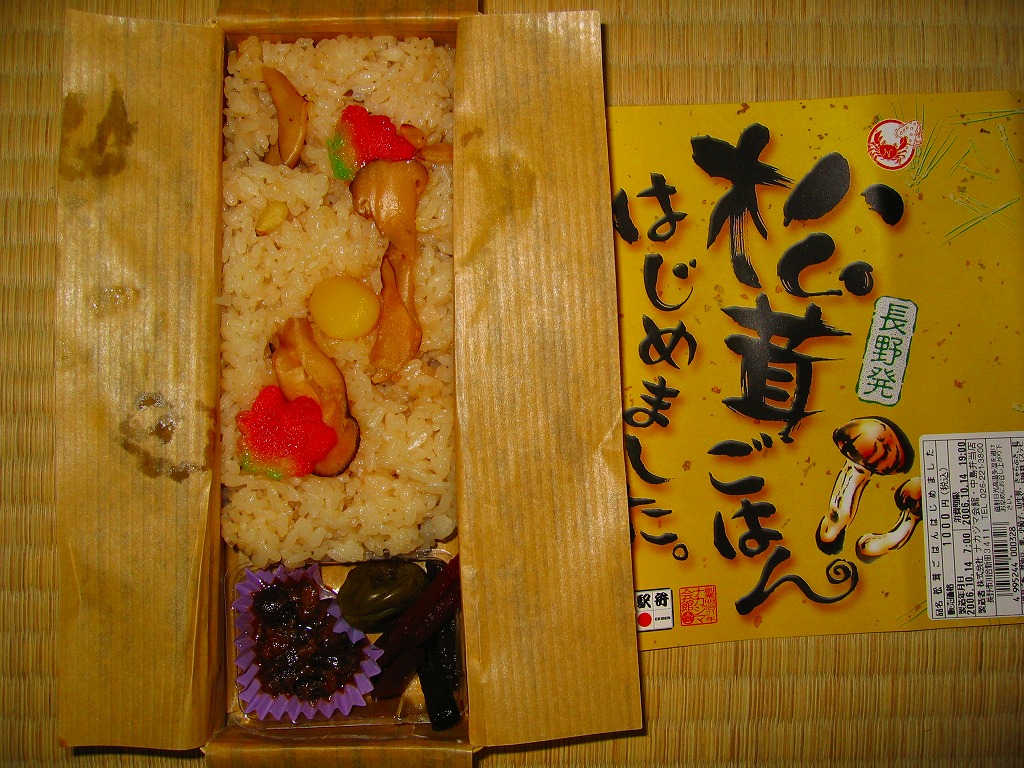 2004(平成16)年の秋に発売か。長野駅の他の駅弁でも使われる、小柄で細長い竹編み容器に割りばしなどを置き、商品名と宣伝文を描いた黄色い掛紙で巻いて、紙ひもでしばる。竹皮柄の紙に包まれた中身は、松の実混じりの松茸御飯に醤油豆や小ナスなど。